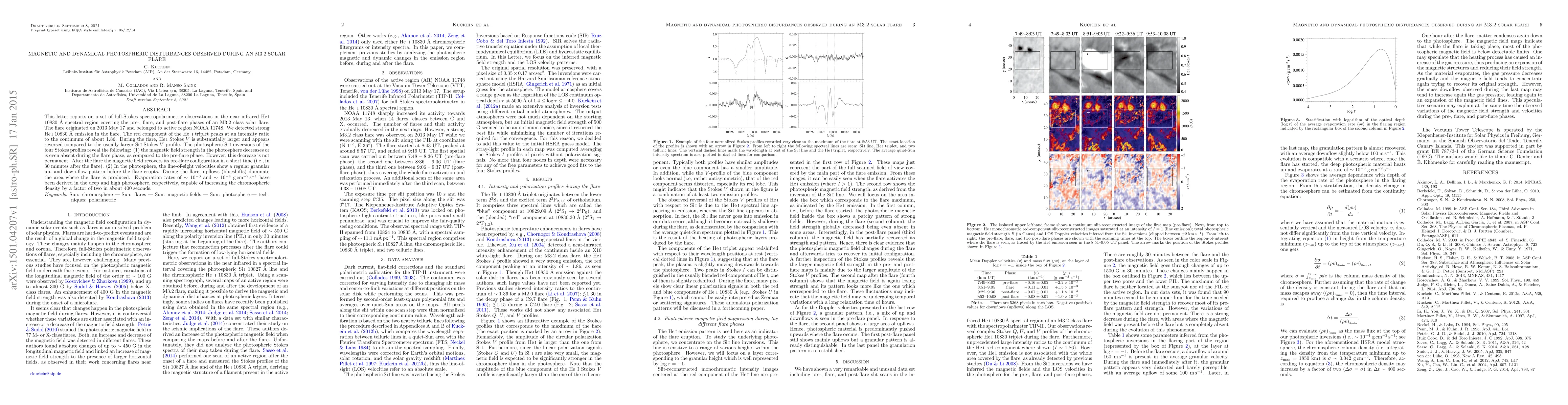 This letter reports on a set of full-Stokes spectropolarimetric observations in the near infrared He I 10830 A spectral region covering the pre-, flare, and post-flare phases of an M3.2 class solar flare. The flare originated on 2013 May 17 and belonged to active region NOAA 11748. We detected strong He I 10830 A emission in the flare. The red component of the He I triplet peaks at an intensity ratio to the continuum of about 1.86. During the flare, He I Stokes V is substantially larger and appears reversed compared to the usually larger Si I Stokes V profile. The photospheric Si I inversions of the four Stokes profiles reveal the following: (1) the magnetic field strength in the photosphere decreases or is even absent during the flare phase, as compared to the pre-flare phase. However, this decrease is not permanent. After the flare the magnetic field recovers its pre-flare configuration in a short time (i.e., in 30 minutes after the flare). (2) In the photosphere, the line-of-sight velocities show a regular granular up- and down-flow pattern before the flare erupts. During the flare, upflows (blueshifts) dominate the area where the flare is produced. Evaporation rates of ~ $10^{-3}$ and ~ $10^{-4}$ g cm$^{-2}$ s$^{-1}$ have been derived in the deep and high photosphere, respectively, capable of increasing the chromospheric density by a factor of two in about 400 seconds.