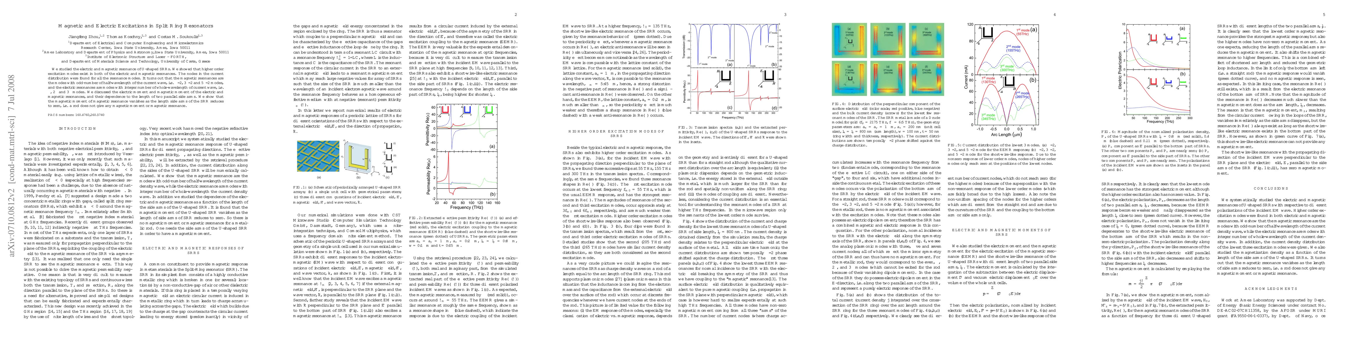 We studied the electric and magnetic resonance of U-shaped SRRs. We showed that higher order excitation modes exist in both of the electric and magnetic resonances. The nodes in the current distribution were found for all the resonance modes. It turns out that the magnetic resonances are the modes with odd-number of half-wavelength of the current wave, i.e. 1/2, 3/2 and 5/2 wavelengths modes, and the electric resonances are modes with integer number of whole-wavelength of current wave, i.e. 1, 2 and 3 wavelengths modes. We discussed the electric moment and magnetic moment of the electric and magnetic resonances, and their dependence to the length of two parallel side arms. We show that the magnetic moment of magnetic resonance vanishes as the length side arms of the SRR reduces to zero, i.e. a rod does not give any magnetic moment or magnetic resonance.