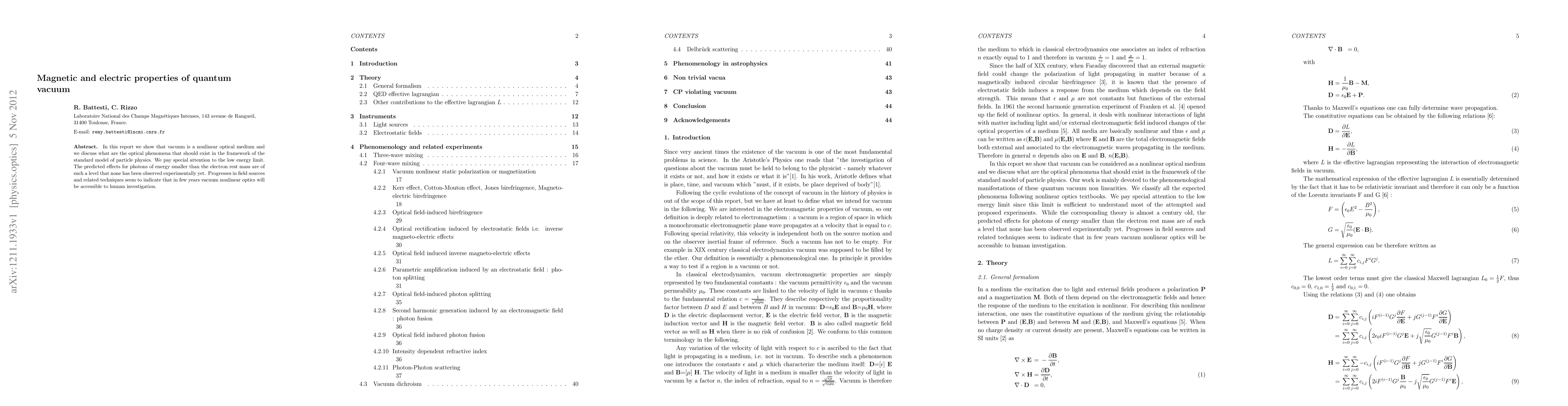 In this report we show that vacuum is a nonlinear optical medium and we discuss what are the optical phenomena that should exist in the framework of the standard model of particle physics. We pay special attention to the low energy limit. The predicted effects for photons of energy smaller than the electron rest mass are of such a level that none has been observed experimentally yet. Progresses in field sources and related techniques seem to indicate that in few years vacuum nonlinear optics will be accessible to human investigation.