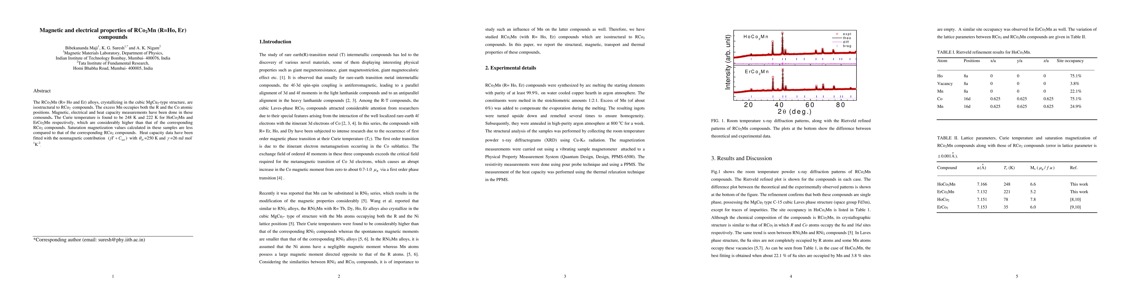 The RCo2Mn (R= Ho and Er) alloys, crystallizing in the cubic MgCu2-type structure, are isostructural to RCo2 compounds. The excess Mn occupies both the R and the Co atomic positions. Magnetic, electrical and heat capacity measurements have been done in these comounds. The Curie temperature is found to be 248 K and 222 K for HoCo2Mn and ErCo2Mn respectively, which are considerably higher than that of the corresponding RCo2 compounds. Saturation magnetization values calculated in these samples are less compared to that of the corresponding RCo2 compounds. Heat capacity data have been fitted with the nonmagnetic contribution with Debye temperature =250 K and electronic coefficient=26 mJ mol^-1K^-2.