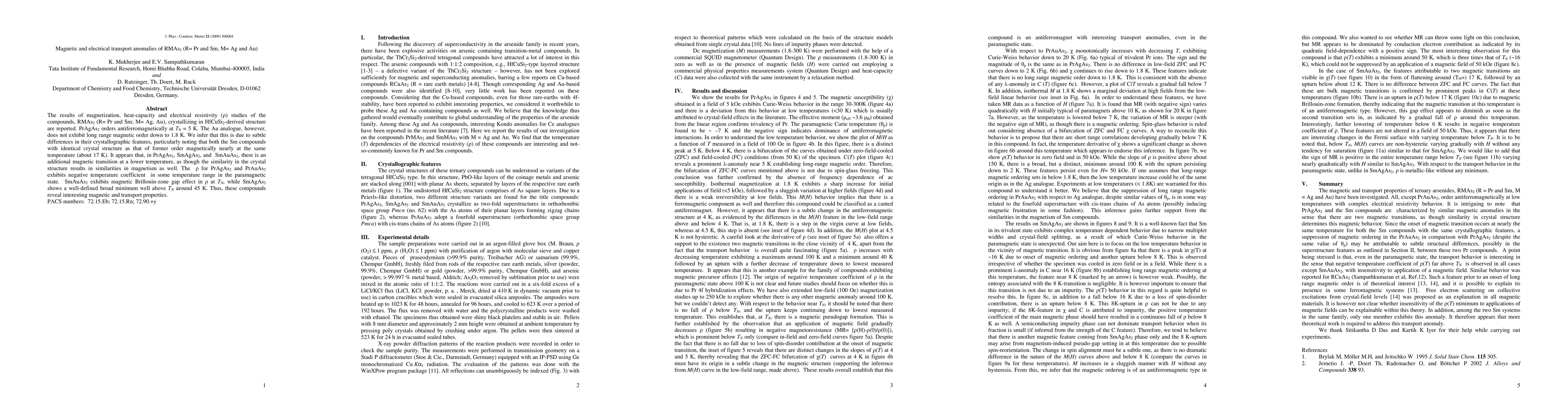 The results of magnetization, heat-capacity, and electrical resistivity (rho) studies of the compounds, RMAs2 (R= Pr and Sm; M= Ag, Au), crystallizing in HfCuSi2-derived structure are reported. PrAgAs2 orders antiferromagnetically at T_N= 5 K. The Au analogue, however, does not exhibit long range magnetic order down to 1.8 K. We infer that this is due to subtle differences in their crystallographic features, particularly noting that both the Sm compounds with identical crystal structure as that of former order magnetically nearly at the same temperature (about 17 K). It appears that, in PrAgAs2, SmAgAs2, and SmAuAs2, there is an additional magnetic transition at a lower temperature, as though the similarity in the crystal structure results in similarities in magnetism as well. The rho for PrAgAs2 and PrAuAs2 exhibits negative temperature coefficient in some temperature range in the paramagnetic state. SmAuAs2 exhibits magnetic Brillouin-zone gap effect in rho at T_N, while SmAgAs2 shows a well-defined broad minimum well above T_N around 45 K. Thus, these compounds reveal interesting magnetic and transport properties.