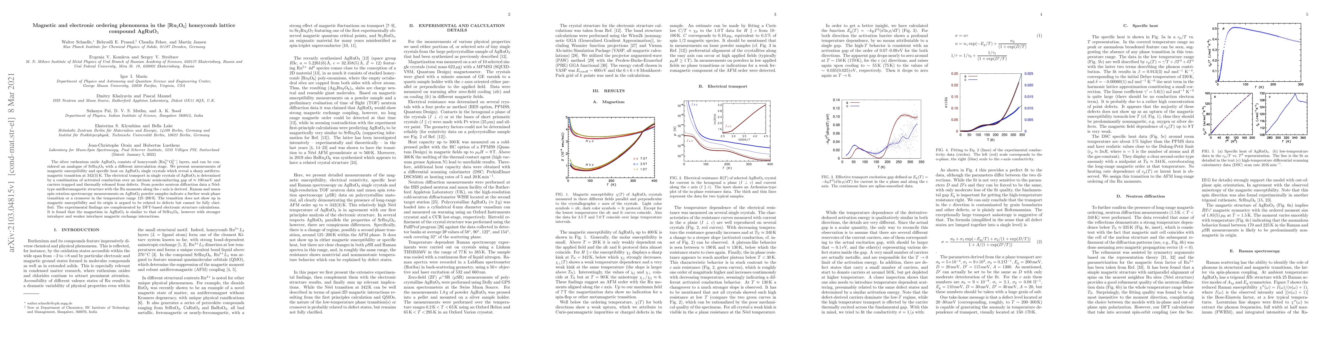 The silver ruthenium oxide AgRuO$_3$ consists of honeycomb [Ru$_2^{5+}$O$_6^{2-}$] layers, and can be considered an analogue of SrRu$_2$O$_6$ with a different intercalation stage. We present measurements of magnetic susceptibility and specific heat on AgRuO$_3$ single crystals which reveal a sharp antiferromagnetic transition at 342(3)K. The electrical transport in single crystals of AgRuO$_3$ is determined by a combination of activated conduction over an intrinsic semiconducting gap of $\approx$ 100 meV and carriers trapped and thermally released from defects. From powder neutron diffraction data a N\'eel-type antiferromagnetic structure with the Ru moments along the $c$ axis is derived. Raman and muon spin rotation spectroscopy measurements on AgRuO$_3$ powder samples indicate a further weak phase transition or a crossover in the temperature range 125-200 K. The transition does not show up in magnetic susceptibility and its origin is argued to be related to defects but cannot be fully clarified. The experimental findings are complemented by DFT-based electronic structure calculations. It is found that the magnetism in AgRuO$_3$ is similar to that of SrRu$_2$O$_6$, however with stronger intralayer and weaker interlayer magnetic exchange interactions.