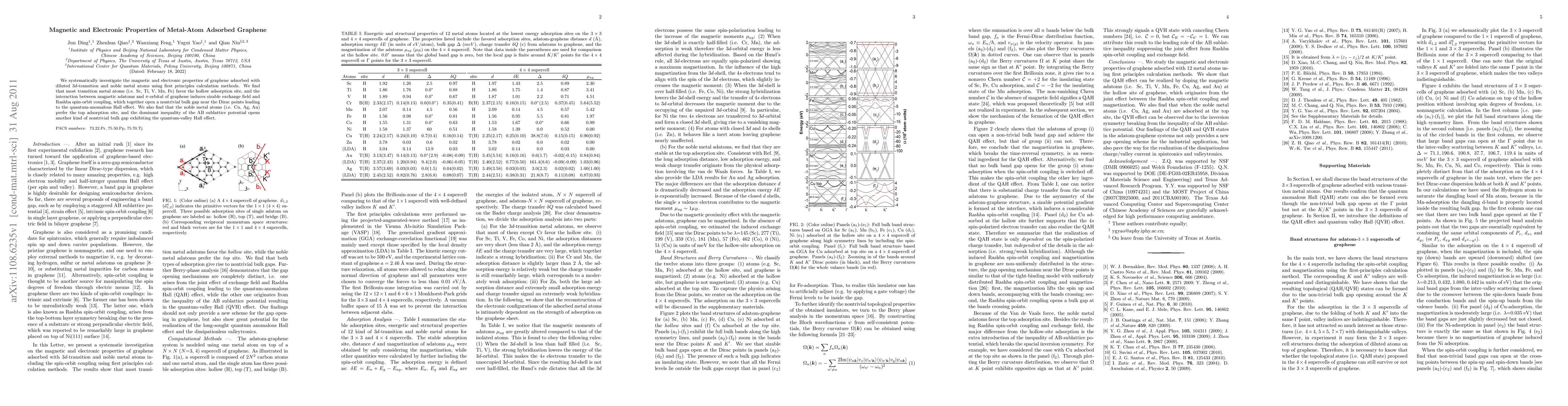 This study investigates the magnetic and electronic properties of graphene when adsorbed with transition and noble metal atoms, revealing that transition metals induce a quantum-anomalous Hall effect, while noble metals lead to a quantum-valley Hall effect due to their preferred adsorption sites and interactions with graphene's π-orbitals.