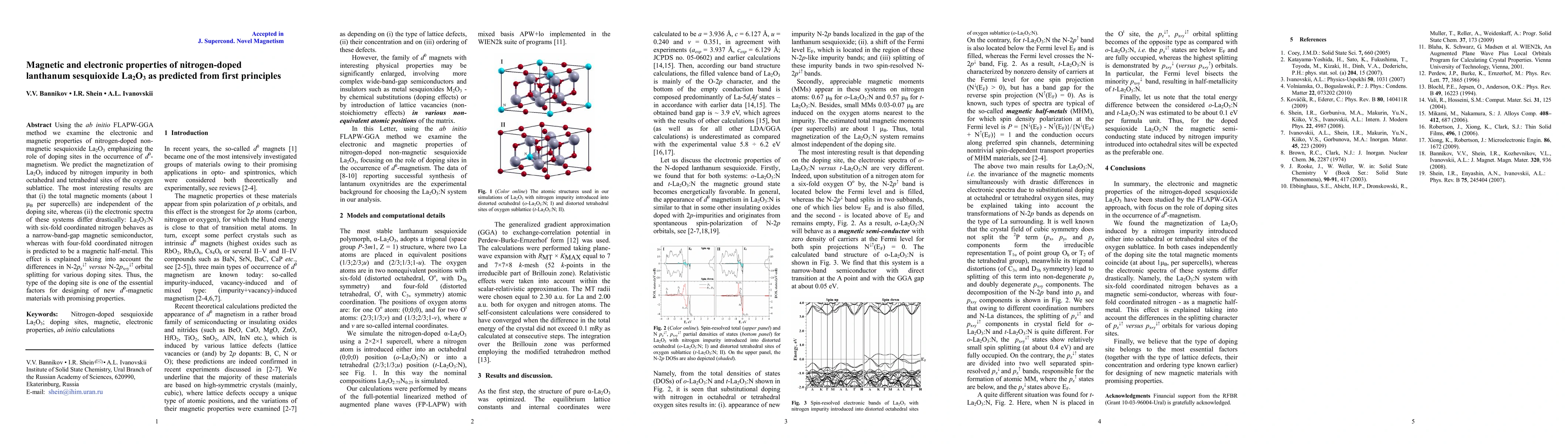 This study predicts the magnetic and electronic properties of nitrogen-doped La2O3 using first principles calculations, finding that doping sites significantly influence the material's behavior, with different magnetic properties and electronic spectra depending on whether nitrogen occupies octahedral or tetrahedral sites.