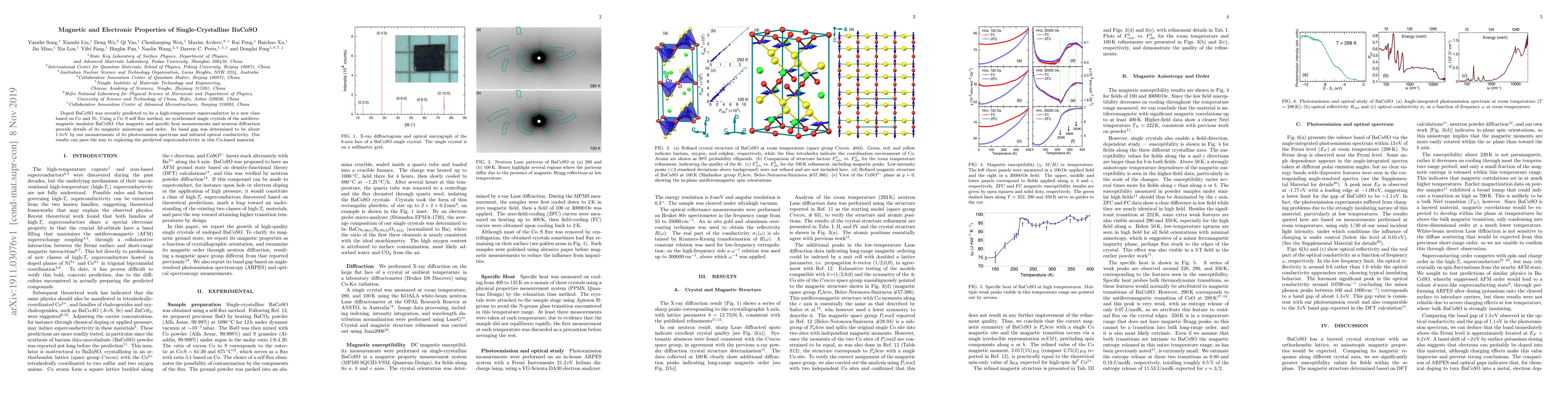Doped BaCoSO was recently predicted to be a high-temperature superconductor in a new class based on Co and Ni. Using a Co-S self flux method, we synthesized single crystals of the antiferromagnetic insulator BaCoSO. Our magnetic and specific heat measurements and neutron diffraction provide details of its magnetic anisotropy and order. Its band gap was determined to be about 1.3 eV by our measurements of its photoemission spectrum and infrared optical conductivity. Our results can pave the way to exploring the predicted superconductivity in this Co-based material.