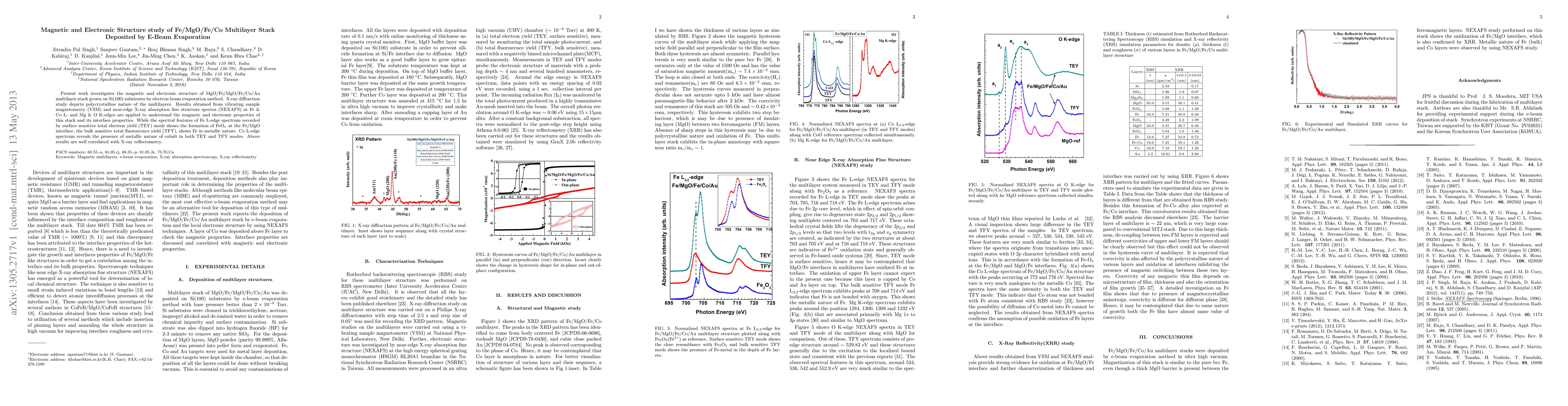 Present work investigates the magnetic and electronic structure of MgO/Fe/MgO/Fe/Co/Au multilayer stack grown on Si(100) substrates by electron beam evaporation method. X-ray diffraction study depicts polycrystalline nature of the multilayers. Results obtained from vibrating sample magnetometry (VSM) and near-edge X-ray absorption fine structure spectra (NEXAFS) at Fe & Co L- and Mg & O K-edges are applied to understand the magnetic and electronic properties of this stack and its interface properties. While the spectral features of Fe L-edge spectrum recorded by surface sensitive total electron yield (TEY) mode shows the formation of FeOx at the Fe/MgO interface, the bulk sensitive total fluorescence yield (TFY), shows Fe in metallic nature. Co L-edge spectrum reveals the presence of metallic nature of cobalt in both TEY and TFY modes. Above results are well correlated with X-ray reflectometry.