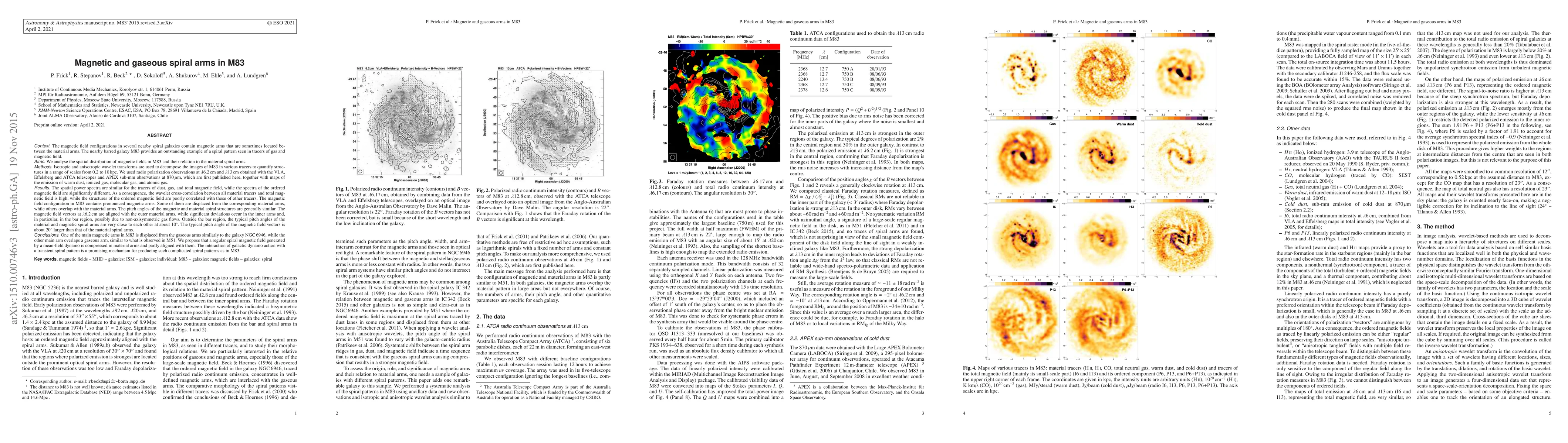 This paper uses wavelet transforms and various observational data to analyze the structures in M83, finding that while the magnetic and gaseous spiral arms share similar spatial power spectra, the ordered magnetic field differs significantly. The study reveals that magnetic arms in M83 are either displaced or overlap with material arms, suggesting a complex interaction between galactic dynamo action and transient spiral patterns.