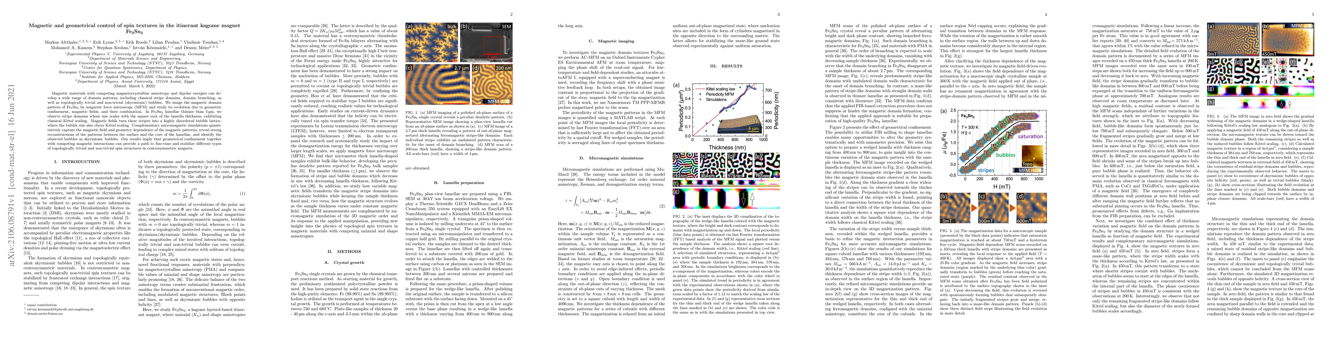 Magnetic materials with competing magnetocrystalline anisotropy and dipolar energies can develop a wide range of domain patterns, including classical stripe domains, domain branching, as well as topologically trivial and non-trivial (skyrmionic) bubbles. We image the magnetic domain pattern of Fe$_3$Sn$_2$ by magnetic force microscopy (MFM) and study its evolution due to geometric confinement, magnetic fields, and their combination. In Fe$_3$Sn$_2$ lamellae thinner than 3 $\mu$m, we observe stripe domains whose size scales with the square root of the lamella thickness, exhibiting classical Kittel scaling. Magnetic fields turn these stripes into a highly disordered bubble lattice, where the bubble size also obeys Kittel scaling. Complementary micromagnetic simulations quantitatively capture the magnetic field and geometry dependence of the magnetic patterns, reveal strong reconstructions of the patterns between the surface and the core of the lamellae, and identify the observed bubbles as skyrmionic bubbles. Our results imply that geometrical confinement together with competing magnetic interactions can provide a path to fine-tune and stabilize different types of topologically trivial and non-trivial spin structures in centrosymmetric magnets.