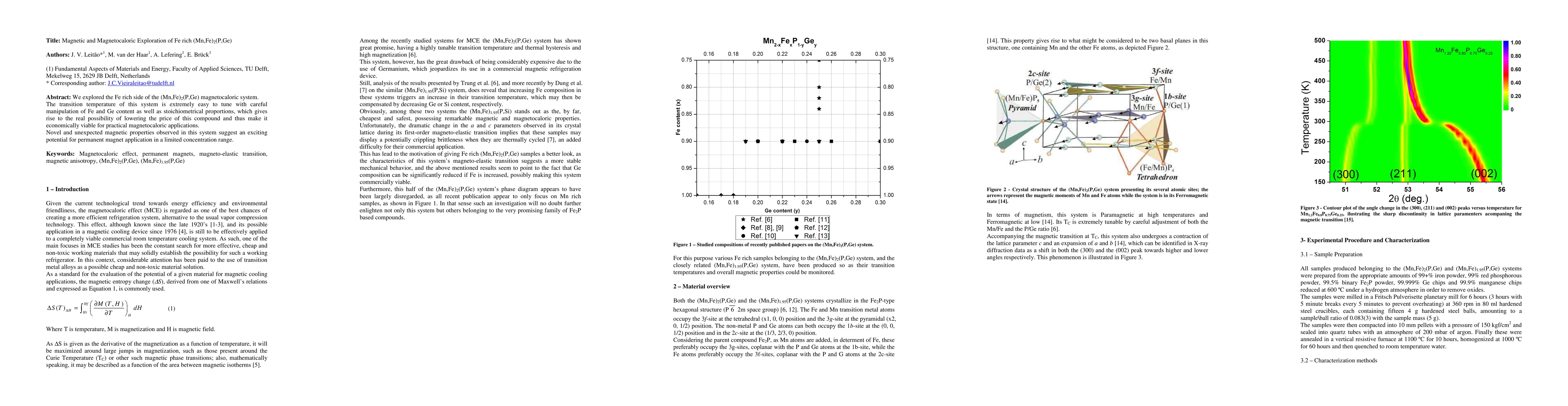 We explored the Fe rich side of the (Mn,Fe)2(P,Ge) magnetocaloric system. The transition temperature of this system is extremely easy to tune with careful manipulation of Fe and Ge content as well as stoichiometrical proportions, which gives rise to the real possibility of lowering the price of this compound and thus make it economically viable for practical magnetocaloric applications. Novel and unexpected magnetic properties observed in this system suggest an exciting potential for permanent magnet application in a limited concentration range.