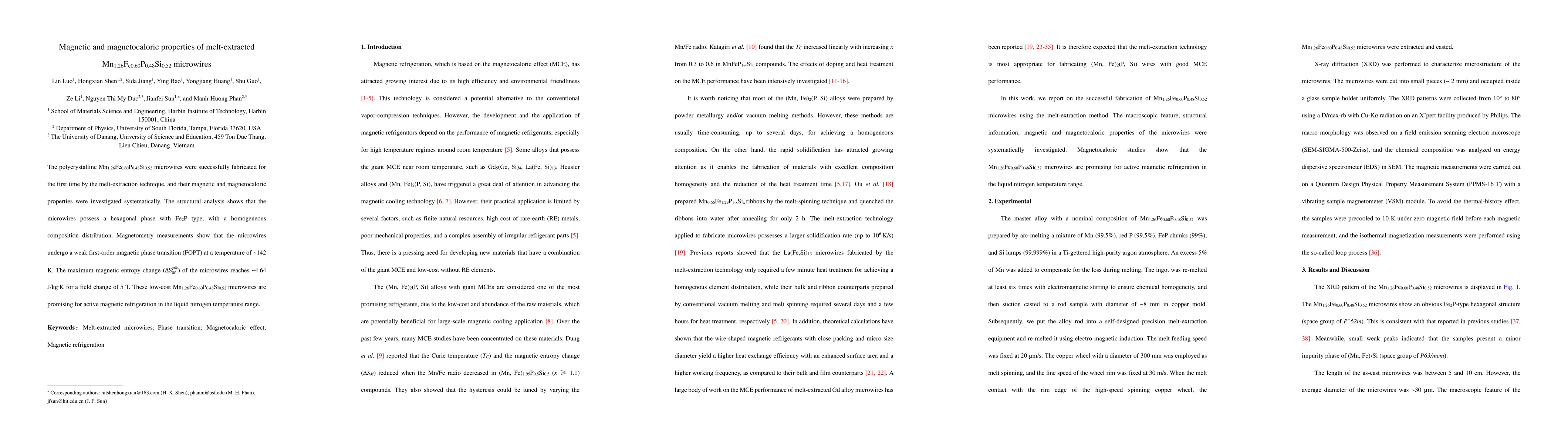 Researchers created Mn1.26Fe0.60P0.48Si0.52 microwires using a new fabrication method, showing promise for magnetic refrigeration in liquid nitrogen temperatures with a record 4.64 Jkg-1K-1 magnetic entropy change.