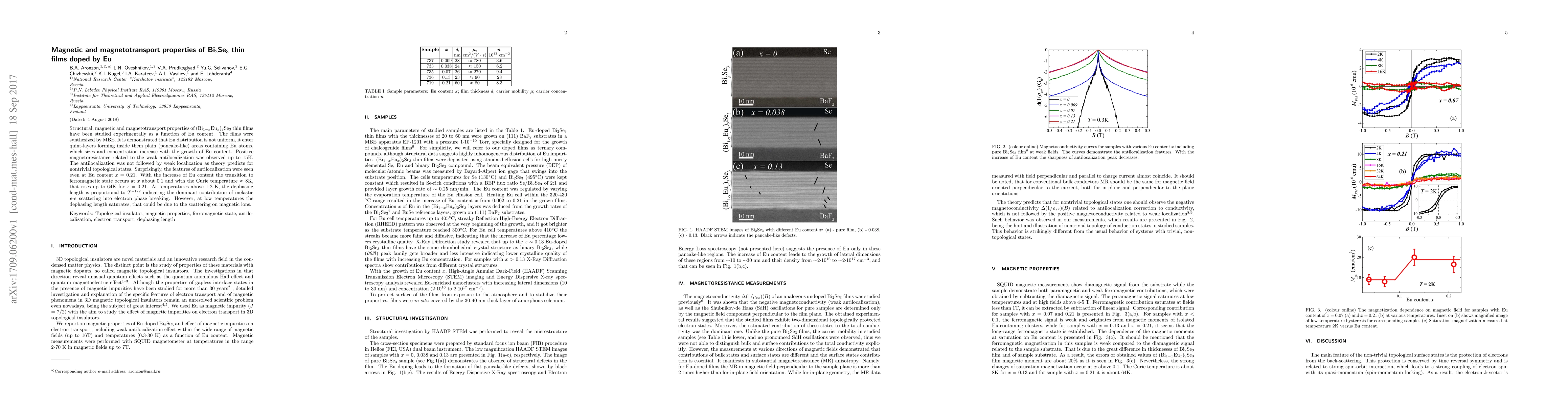 Researchers studied Bi$_2$Se$_3$ thin films doped with Eu, observing a transition to ferromagnetic behavior at low temperatures and a positive magnetoresistance effect up to 15K.