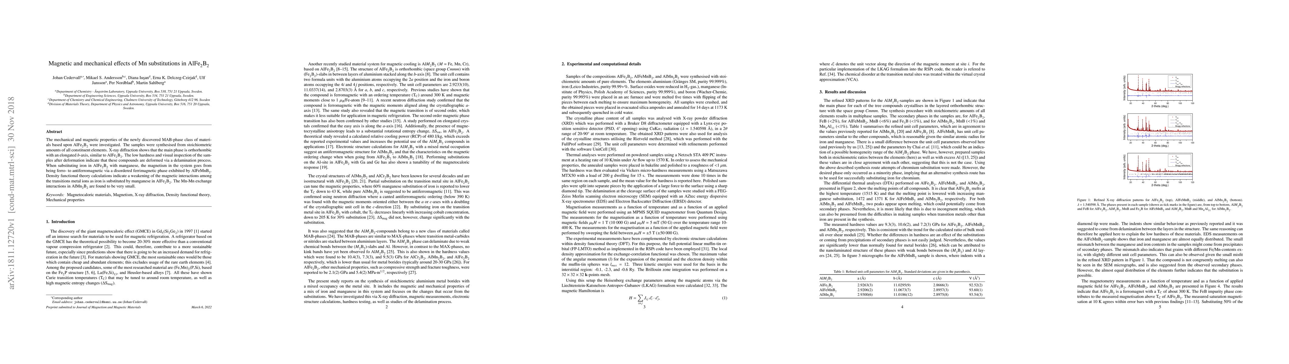 The mechanical and magnetic properties of the newly discovered MAB-phase class of materials based upon AlFe2B2 were investigated. The samples were synthesised from stoichiometric amounts of all constituent elements. X-ray diffraction shows that the main phase is orthorhombic with an elongated b-axis, similar to AlFe2B2. The low hardness and visual inspection of the samples after deformation indicate that these compounds are deformed via a delamination process. When substituting iron in AlFe2B2 with manganese, the magnetism in the system goes from being ferro- to antiferromagnetic via a disordered ferrimagnetic phase exhibited by AlFeMnB2. Density functional theory calculations indicate a weakening of the magnetic interactions among the transitions metal ions as iron is substituted by manganese in AlFe2B2. The Mn-Mn exchange interactions in AlMn2 B2 are found to be very small.