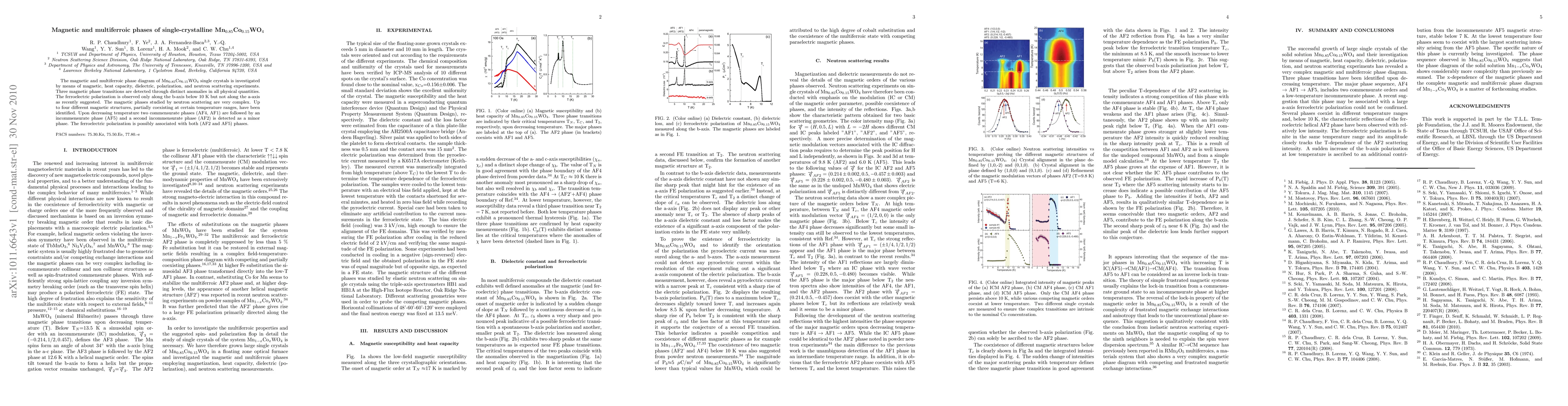 The magnetic and multiferroic phase diagram of Mn$_{0.85}$Co$_{0.15}$WO$_4$ single crystals is investigated by means of magnetic, heat capacity, dielectric, polarization, and neutron scattering experiments. Three magnetic phase transitions are detected through distinct anomalies in all physical quantities. The ferroelectric polarization is observed only along the b-axis below 10 K but not along the a-axis as recently suggested. The magnetic phases studied by neutron scattering are very complex. Up to four different magnetic structures, partially coexisting at certain temperature ranges, have been identified. Upon decreasing temperature two commensurate phases (AF4, AF1) are followed by an incommensurate phase (AF5) and a second incommensurate phase (AF2) is detected as a minor phase. The ferroelectric polarization is possibly associated with both (AF2 and AF5) phases.