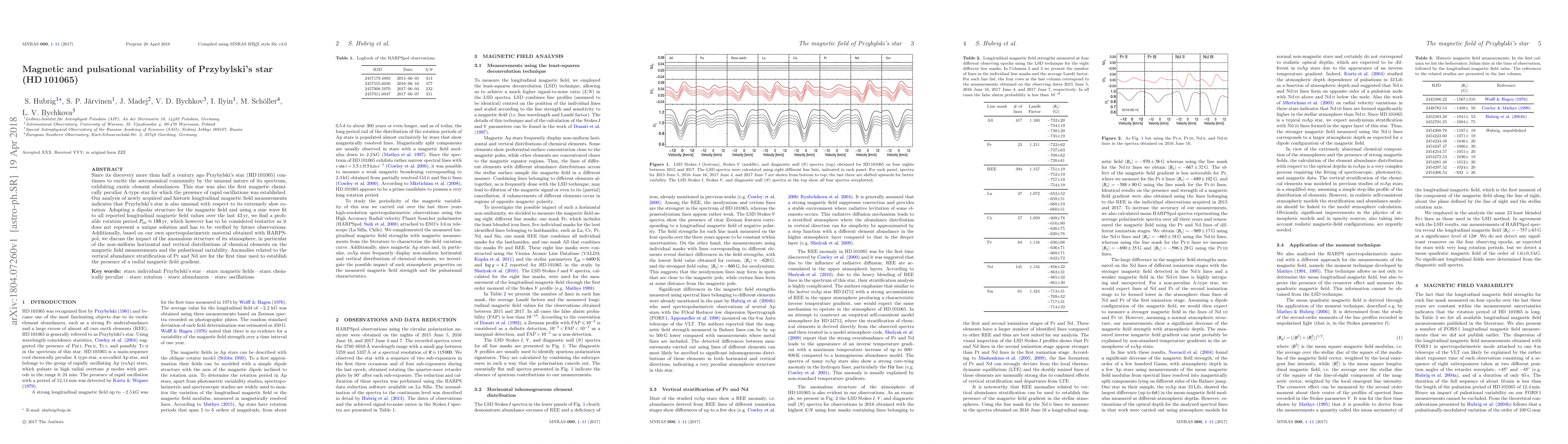 Since its discovery more than half a century ago Przybylski's star (HD101065) continues to excite the astronomical community by the unusual nature of its spectrum, exhibiting exotic element abundances. This star was also the first magnetic chemically peculiar A-type star for which the presence of rapid oscillations was established. Our analysis of newly acquired and historic longitudinal magnetic field measurements indicates that Przybylski's star is also unusual with respect to its extremely slow rotation. Adopting a dipolar structure for the magnetic field and using a sine wave fit to all reported longitudinal magnetic field values over the last 43yr, we find a probable rotation period P_rot ~ 188yr, which however has to be considered tentative as it does not represent a unique solution and has to be verified by future observations. Additionally, based on our own spectropolarimetric material obtained with HARPSpol, we discuss the impact of the anomalous structure of its atmosphere, in particular of the non-uniform horizontal and vertical distributions of chemical elements on the magnetic field measurements and the pulsational variability. Anomalies related to the vertical abundance stratification of Pr and Nd are for the first time used to establish the presence of a radial magnetic field gradient.