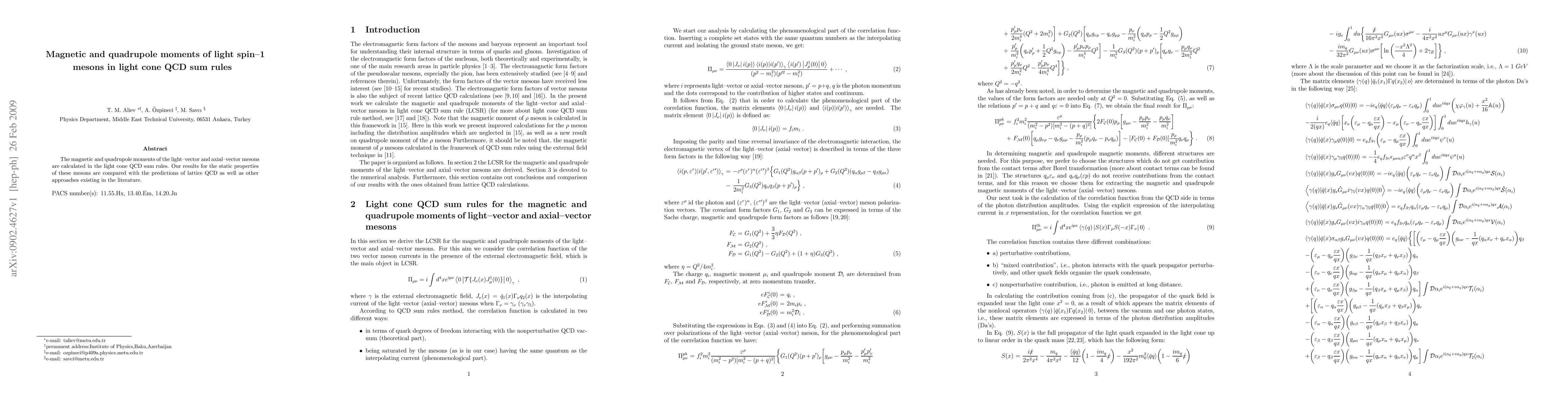 This paper calculates the magnetic and quadrupole moments of light spin-1 mesons using light cone QCD sum rules, comparing its findings with lattice QCD predictions and other theoretical approaches. The results provide insights into the static properties of these mesons.