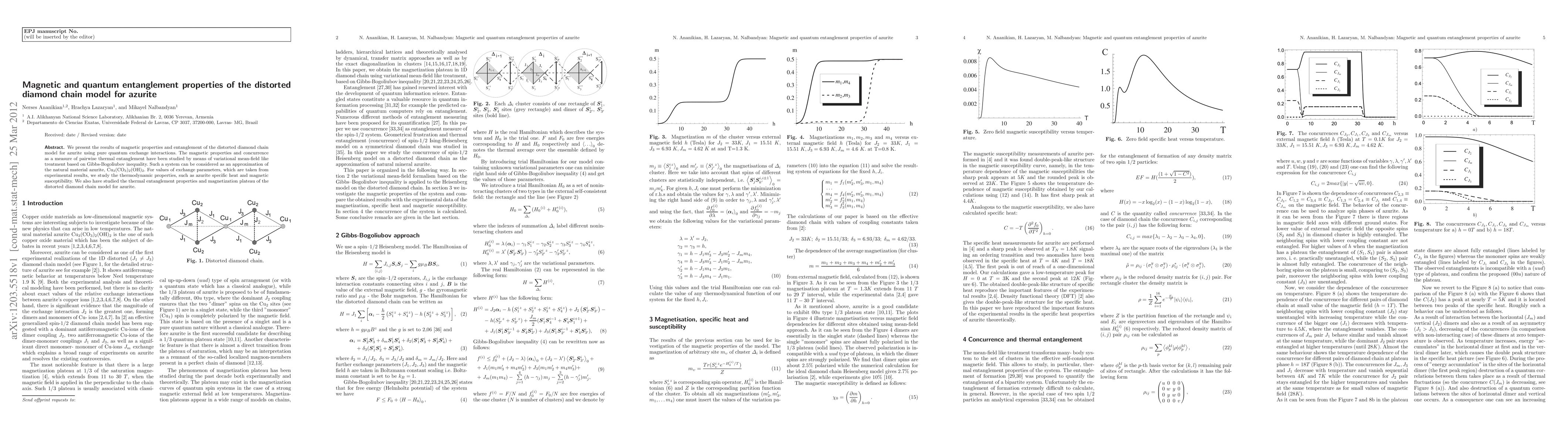 This paper investigates the magnetic and quantum entanglement properties of a distorted diamond chain model for azurite, focusing on the system's magnetic behavior and thermal entanglement using quantum exchange interactions. The study employs variational mean-field methods and examines thermodynamic properties and magnetization plateaus based on experimental exchange parameters.