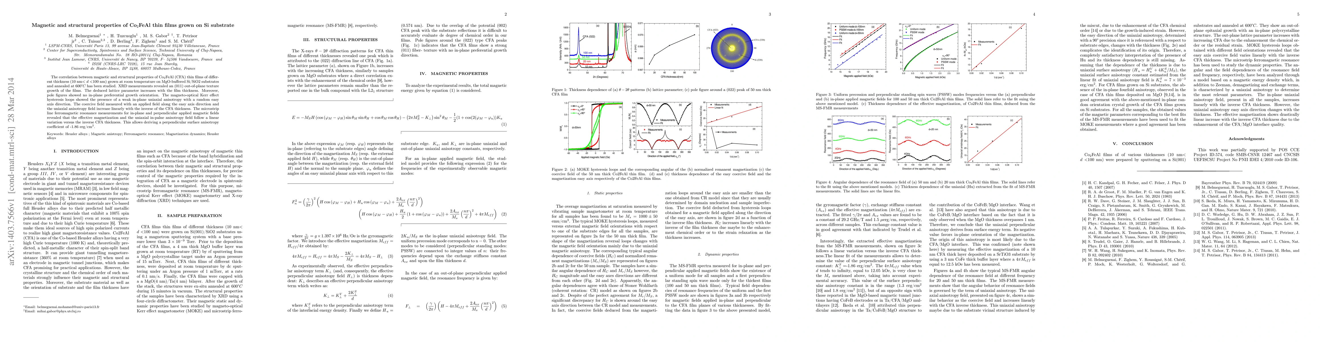 This study investigates the magnetic and structural properties of Co2FeAl thin films grown on Si substrates, revealing an (011) out-of-plane texture and a linear increase in coercive field with the inverse film thickness. The effective magnetization and uniaxial in-plane anisotropy field also vary linearly with the inverse film thickness, indicating a perpendicular surface anisotropy coefficient of -1.86 erg/cm².