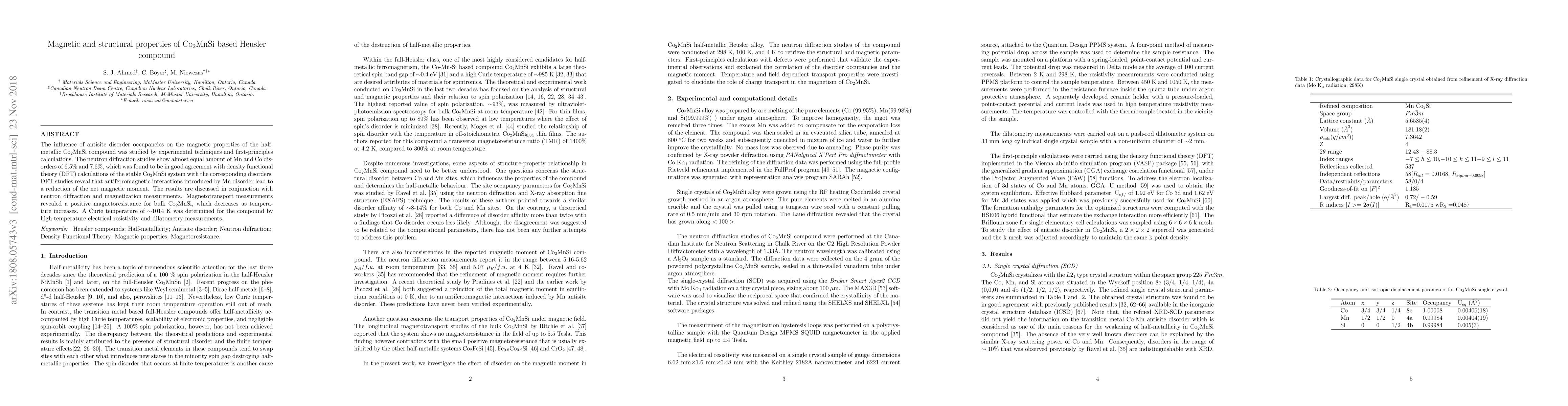 The influence of antisite disorder occupancies on the magnetic properties of the half-metallic Co$_2$MnSi compound was studied by experimental techniques and first-principles calculations. The neutron diffraction studies show almost identical amount of Mn and Co disorders of 6.5\% and 7.6\%, which was found to be in good agreement with density functional theory (DFT) calculations of the stable Co$_2$MnSi system with the corresponding disorders. DFT studies reveal that antiferromagnetic interactions introduced by Mn disorder lead to a reduction of the net magnetic moment. The results are discussed in conjunction with neutron diffraction and magnetization measurements. Transport property measurement under magnetic field up to 9 Tesla revealed a positive magnetoresistance for bulk Co$_2$MnSi that persists up to room temperature. A Curie temperature of $\sim$1014 K was determined for the compound by high temperature electrical resistivity and dilatometry measurements.