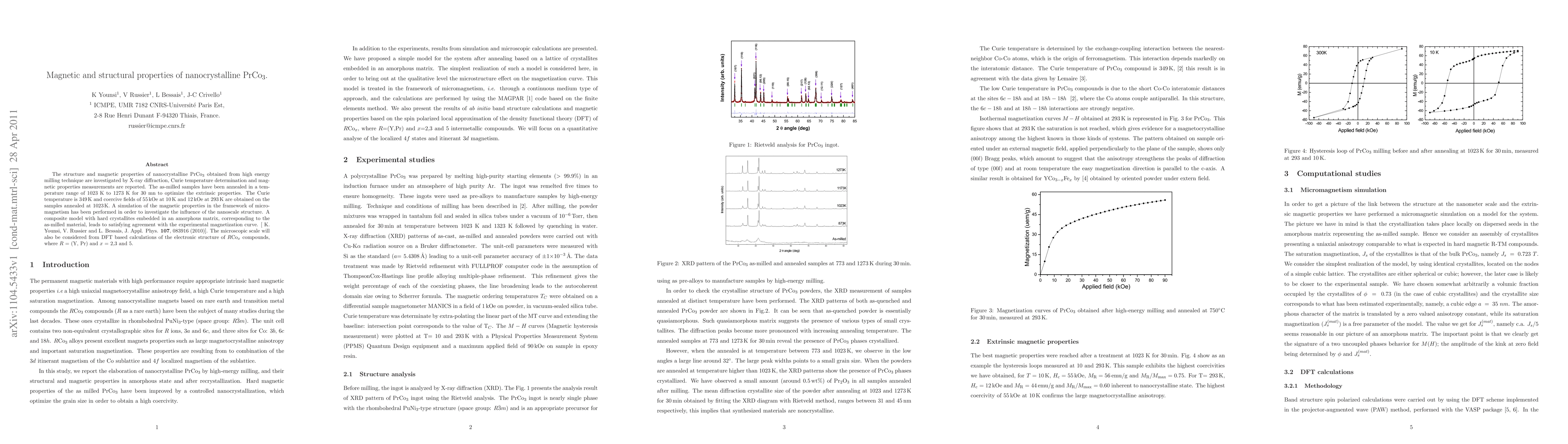 This study examines nanocrystalline PrCo3's structure and magnetic properties using high-energy milling and annealing techniques. The Curie temperature is determined to be 349K, with varying coercive fields at different annealing temperatures. A composite model of hard crystallites in an amorphous matrix explains experimental magnetization curves, supported by micromagnetism simulation. Future DFT-based calculations of electronic structure for RCo_x compounds are also planned.