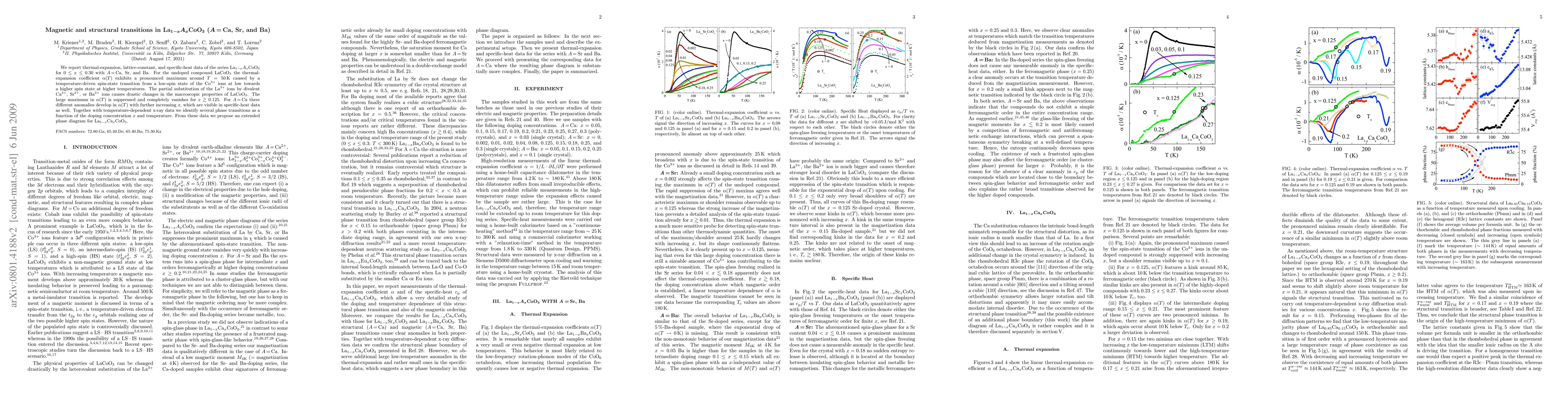 This study investigates the thermal-expansion, lattice-constant, and specific-heat behaviors of La$_{1-x}$A$_{x}$CoO$_{3}$ (A = Ca, Sr, Ba) from x=0 to 0.30, revealing that LaCoO$_3$ undergoes a spin-state transition at T=50K. Doping with Ca, Sr, or Ba suppresses this transition and induces multiple phase transitions, particularly for A=Ca, as evidenced by anomalies in thermal-expansion and specific-heat data.