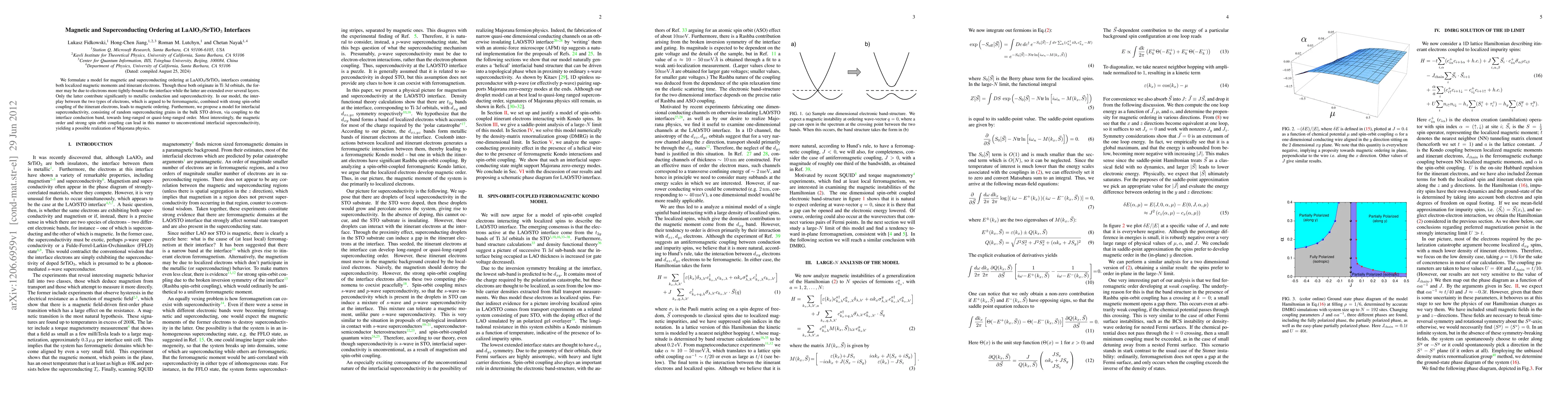 This paper proposes a model explaining magnetic and superconducting phenomena at LaAlO3/SrTiO3 interfaces, where localized magnetic moments and itinerant electrons interact ferromagnetically, leading to magnetic ordering and unconventional superconductivity potentially realizing Majorana physics.