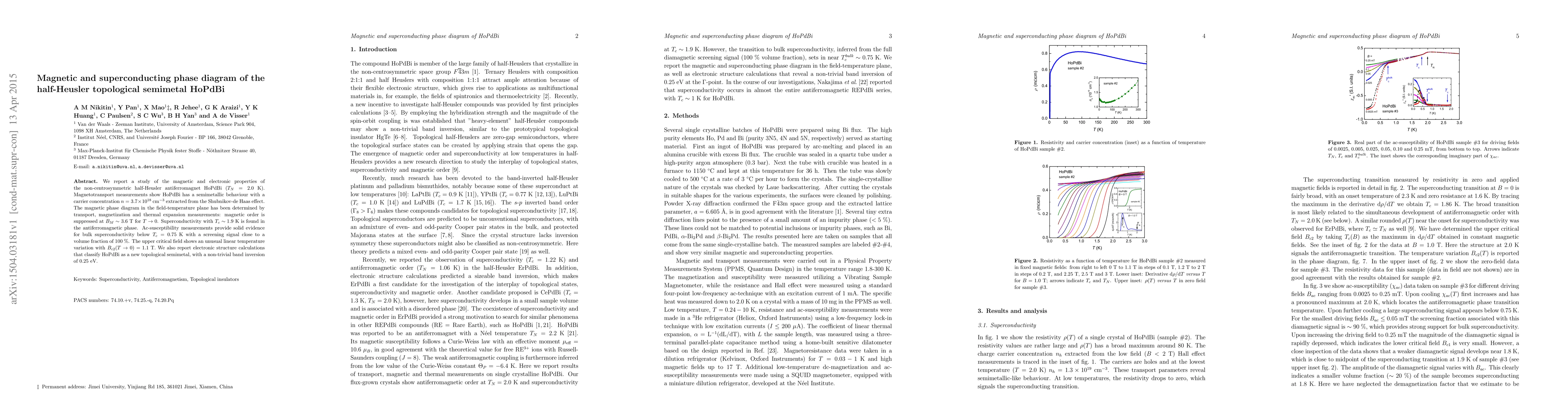 This study investigates the magnetic and superconducting properties of the half-Heusler antiferromagnet HoPdBi, revealing its semimetallic behavior and suppression of magnetic order at 3.6 T. The material exhibits superconductivity at 1.9 K within its antiferromagnetic phase, with a linear upper critical field variation.