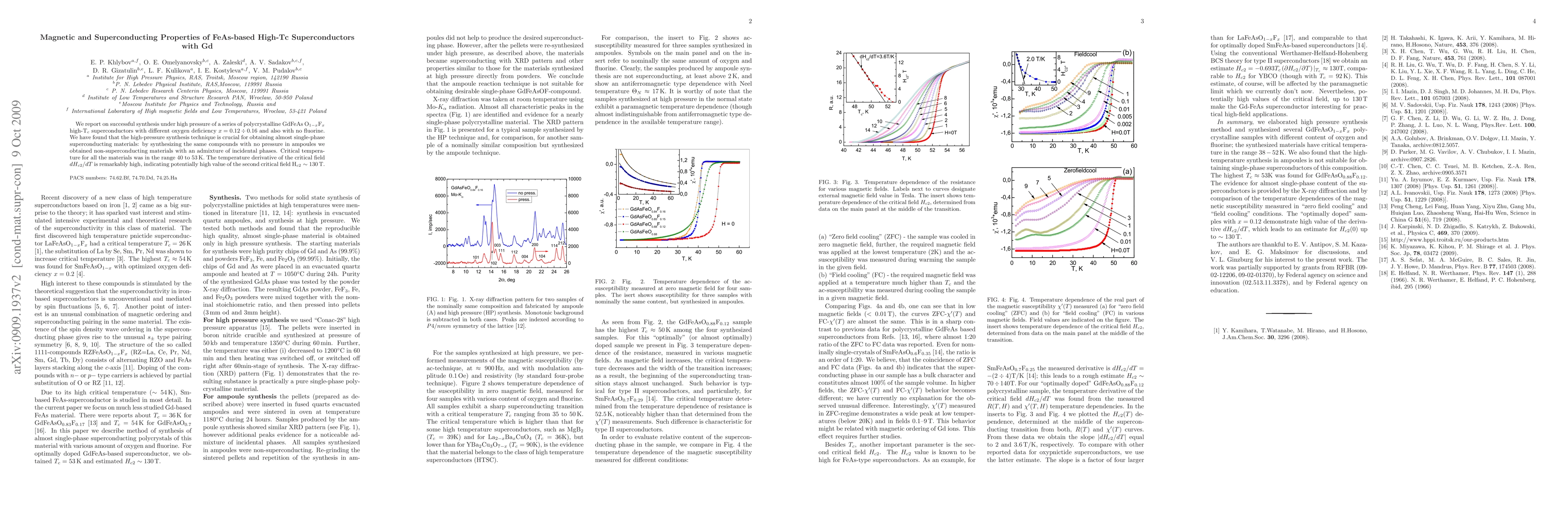 We report on successful synthesis under high pressure of a series of polycrystalline GdFeAs O_{1-x}F_x high-Tc superconductors with different oxygen deficiency x=0.12 - 0.16 and also with no fluorine. We have found that the high-pressure synthesis technique is crucial for obtaining almost single-phase superconducting materials: by synthesizing the same compounds with no pressure in ampoules we obtained non-superconducting materials with an admixture of incidental phases. Critical temperature for all the materials was in the range 40 to 53K. The temperature derivative of the critical field dHc2/dT is remarkably high, indicating potentially high value of the second critical field Hc2 ~ 130T.