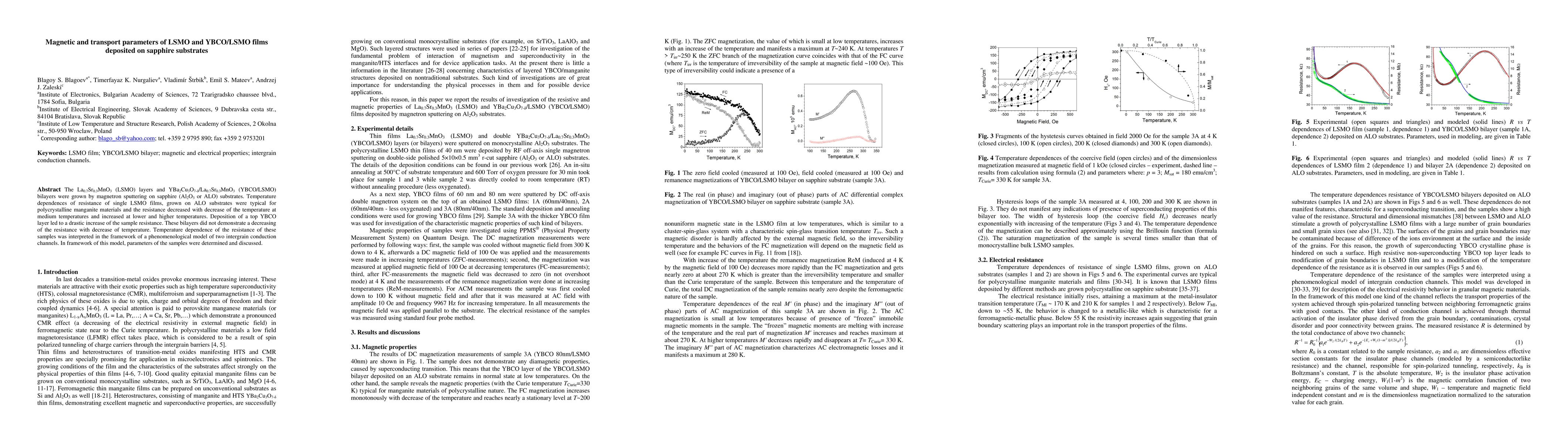 The La0.7Sr0.3MnO3 (LSMO) layers and YBa2Cu3O7-{\delta}/La0.7Sr0.3MnO3 (YBCO/LSMO) bilayers were grown by magnetron sputtering on sapphire (Al2O3 or ALO) substrates. Temperature dependences of resistance of single LSMO films, grown on ALO substrates were typical for polycrystalline manganite materials and the resistance decreased with decrease of the temperature at medium temperatures and increased at lower and higher temperatures. Deposition of a top YBCO layer led to a drastic increase of the sample resistance. These bilayers did not demonstrate a decreasing of the resistance with decrease of temperature. Temperature dependence of the resistance of these samples was interpreted in the framework of a phenomenological model of two intergrain conduction channels. In framework of this model, parameters of the samples were determined and discussed.