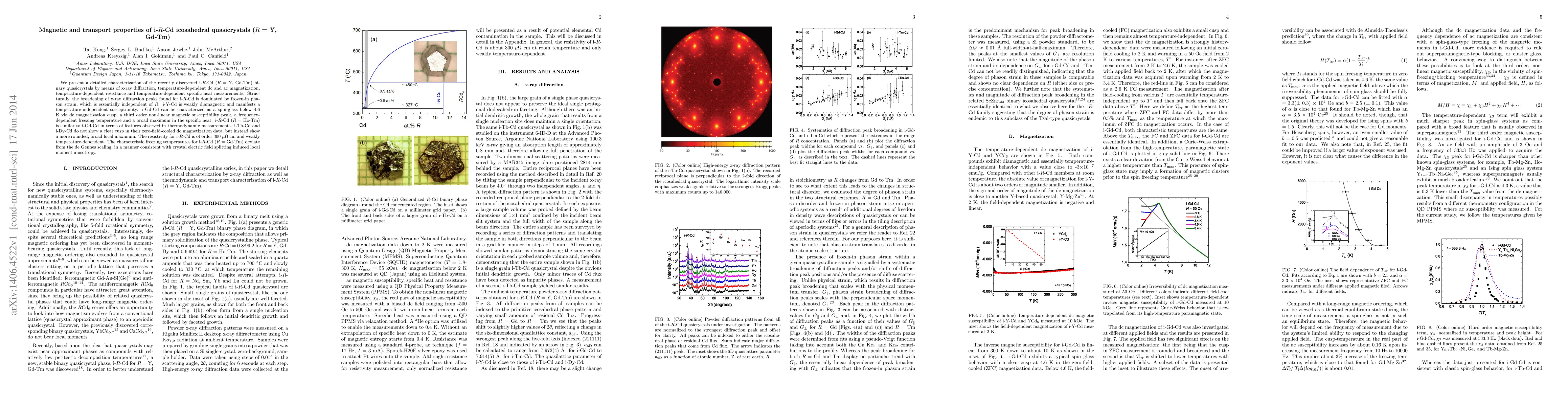 We present a detailed characterization of the recently discovered i-$R$-Cd ($R$ = Y, Gd-Tm) binary quasicrystals by means of x-ray diffraction, temperature-dependent dc and ac magnetization, temperature-dependent resistance and temperature-dependent specific heat measurements. Structurally, the broadening of x-ray diffraction peaks found for i-$R$-Cd is dominated by frozen-in phason strain, which is essentially independent of $R$. i-Y-Cd is weakly diamagnetic and manifests a temperature-independent susceptibility. i-Gd-Cd can be characterized as a spin-glass below 4.6 K via dc magnetization cusp, a third order non-linear magnetic susceptibility peak, a frequency-dependent freezing temperature and a broad maximum in the specific heat. i-$R$-Cd ($R$ = Ho-Tm) is similar to i-Gd-Cd in terms of features observed in thermodynamic measurements. i-Tb-Cd and i-Dy-Cd do not show a clear cusp in their zero-field-cooled dc magnetization data, but instead show a more rounded, broad local maximum. The resistivity for i-$R$-Cd is of order 300 $\mu \Omega$ cm and weakly temperature-dependent. The characteristic freezing temperatures for i-$R$-Cd ($R$ = Gd-Tm) deviate from the de Gennes scaling, in a manner consistent with crystal electric field splitting induced local moment anisotropy.