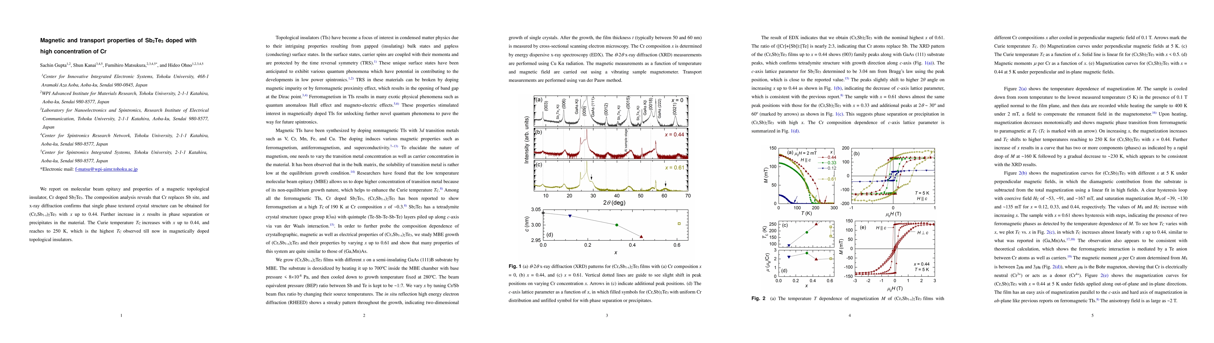 This study investigates the magnetic and transport properties of Cr-doped Sb2Te3, revealing that Cr replaces Sb sites and forms a single-phase textured crystal structure up to 44% doping. The Curie temperature reaches 250 K, the highest observed in magnetically doped topological insulators.