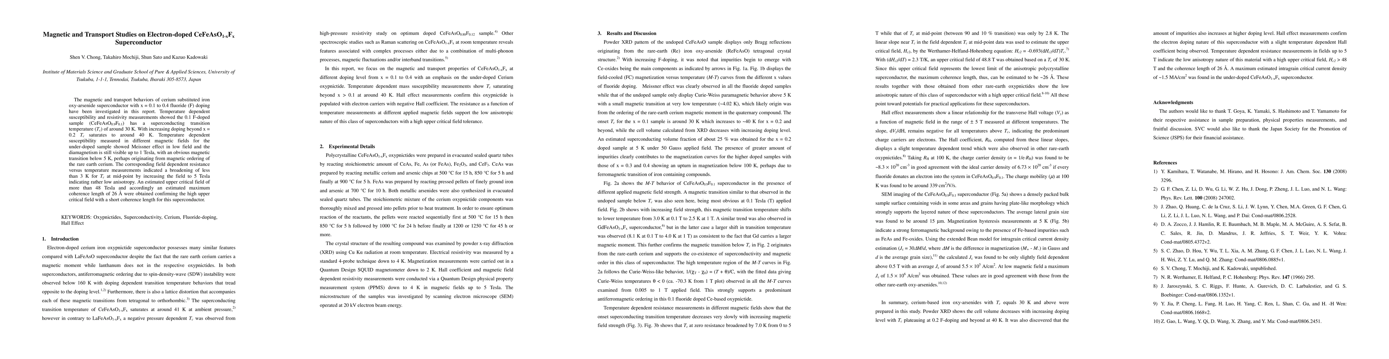 The magnetic and transport behaviors of cerium substituted iron oxy-arsenide superconductor with x = 0.1 to 0.4 fluoride (F) doping have been investigated in this report. Temperature dependent susceptibility and resistivity measurements showed the 0.1 F-doped sample (CeFeAsO0.9F0.1) has a superconducting transition temperature (Tc) of around 30 K. With increasing doping beyond x = 0.2 Tc saturates to around 40 K. Temperature dependent susceptibility measured in different magnetic fields for the under-doped sample showed Meissner effect in low field and the diamagnetism is still visible up to 1 Tesla, with an obvious magnetic transition below 5 K, perhaps originating from magnetic ordering of the rare earth cerium. The corresponding field dependent resistance versus temperature measurements indicated a broadening of less than 3 K for Tc at mid-point by increasing the field to 5 Tesla indicating rather low anisotropy. An estimated upper critical field of more than 48 Tesla and accordingly an estimated maximum coherence length of 2.6 nm were obtained confirming the high upper critical field with a short coherence length for this superconductor.