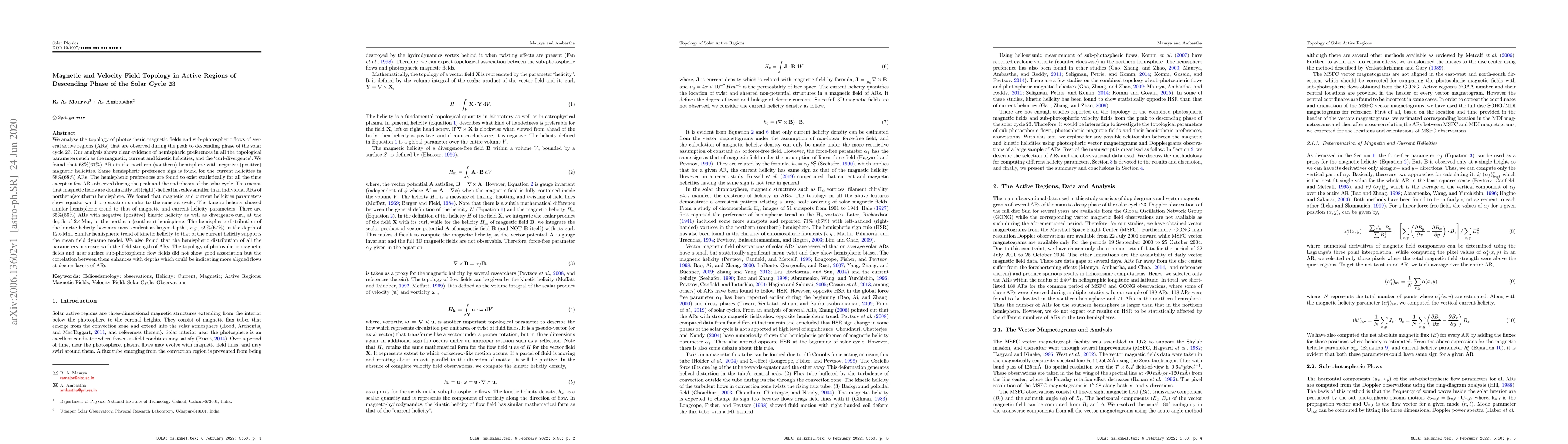 This research reveals hemispheric preferences in magnetic and velocity field topologies during the descending phase of solar cycle 23, showing that 68% of active regions in the northern hemisphere exhibit negative magnetic helicity, while the opposite holds for the southern hemisphere. The study also finds a correlation between these helicities and kinetic helicity, indicating an equator-ward propagation and supporting mean field dynamo models.