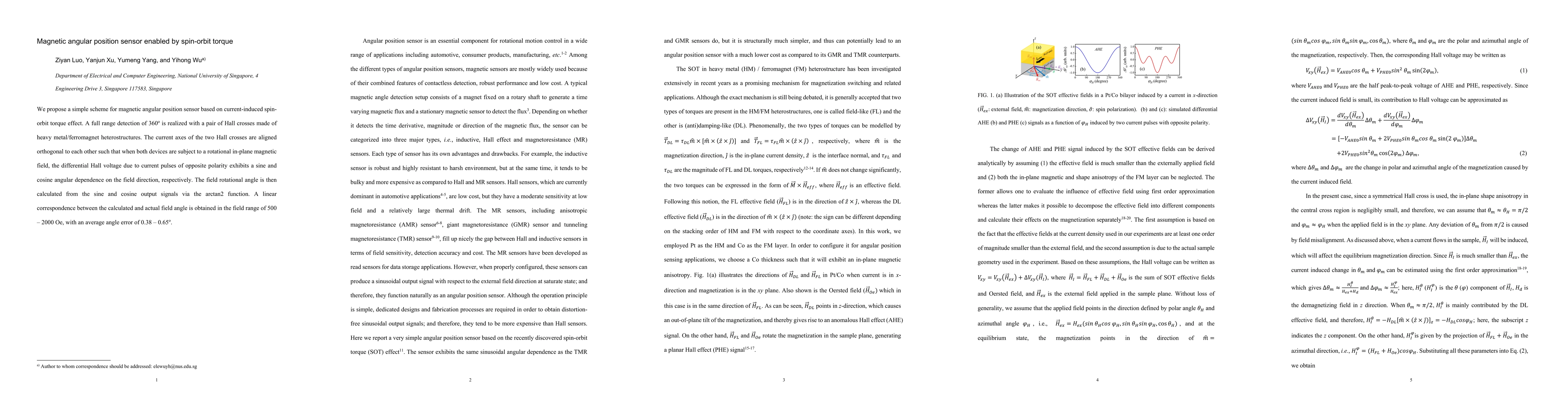 This paper proposes a magnetic angular position sensor utilizing spin-orbit torque in heavy metal/ferromagnet heterostructures. The sensor achieves full 360° detection using orthogonal Hall crosses, with calculated angle errors between 0.38° and 0.65° in the 500-2000 Oe field range.