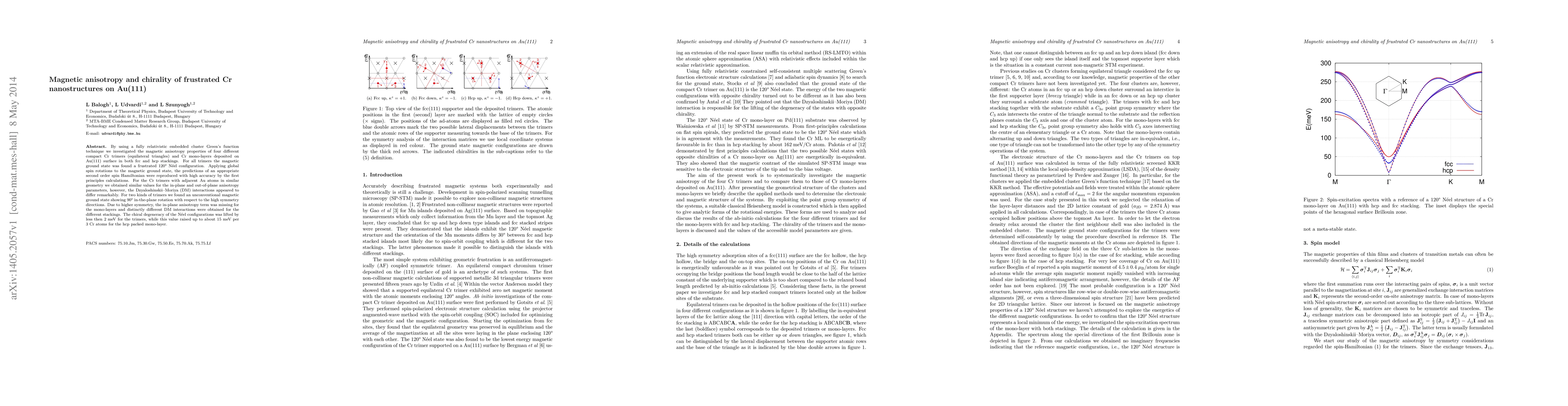 By using a fully relativistic embedded cluster Green's function technique we investigated the magnetic anisotropy properties of four different compact Cr trimers (equilateral triangles) and Cr mono-layers deposited on Au(111) surface in both fcc and hcp stackings. For all trimers the magnetic ground state was found a frustrated 120$^\circ$ N\'eel configuration. Applying global spin rotations to the magnetic ground state, the predictions of an appropriate second order spin Hamiltonian were reproduced with high accuracy by the first principles calculations. For the Cr trimers with adjacent Au atoms in similar geometry we obtained similar values for the in-plane and out-of-plane anisotropy parameters, however, the Dzyaloshinskii-Moriya (DM) interactions appeared to differ remarkably. For two kinds of trimers we found an unconventional magnetic ground state showing 90$^\circ$ in-the-plane rotation with respect to the high symmetry directions. Due to higher symmetry, the in-plane anisotropy term was missing for the mono-layers and distinctly different DM interactions were obtained for the different stackings. The chiral degeneracy of the N\'eel configurations was lifted by less then 2 meV for the trimers, while this value raised up to about 15 meV per 3 Cr atoms for the hcp packed mono-layer.