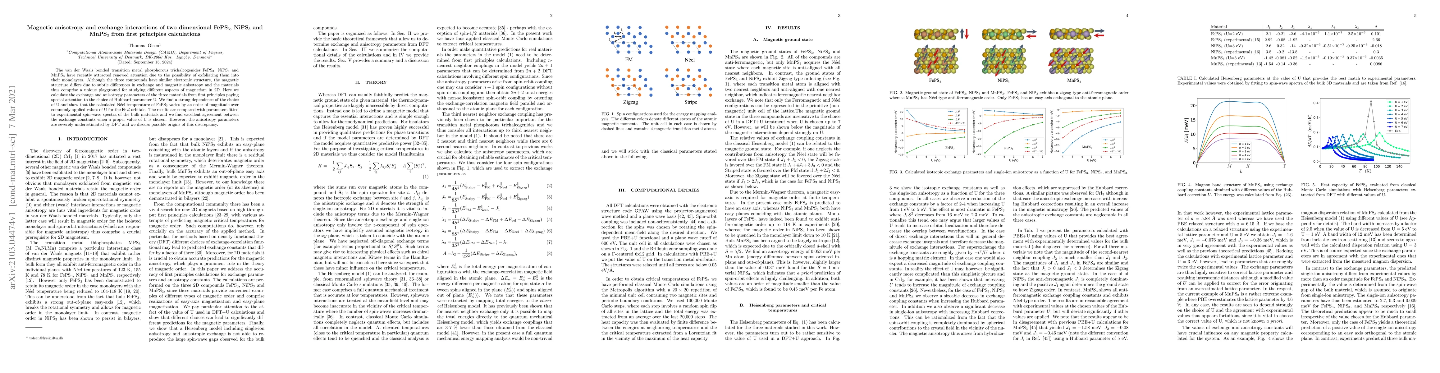 This paper investigates the magnetic anisotropy and exchange interactions of monolayer FePS$_3$, NiPS$_3$, and MnPS$_3$ using first principles calculations. It highlights the strong dependence on the choice of Hubbard parameter U, particularly for FePS$_3$, where the N\'eel temperature varies significantly with different U values. The study finds good agreement between calculated exchange constants and experimental spin-wave data when an appropriate U is selected, but notes discrepancies in the calculated anisotropy parameters.