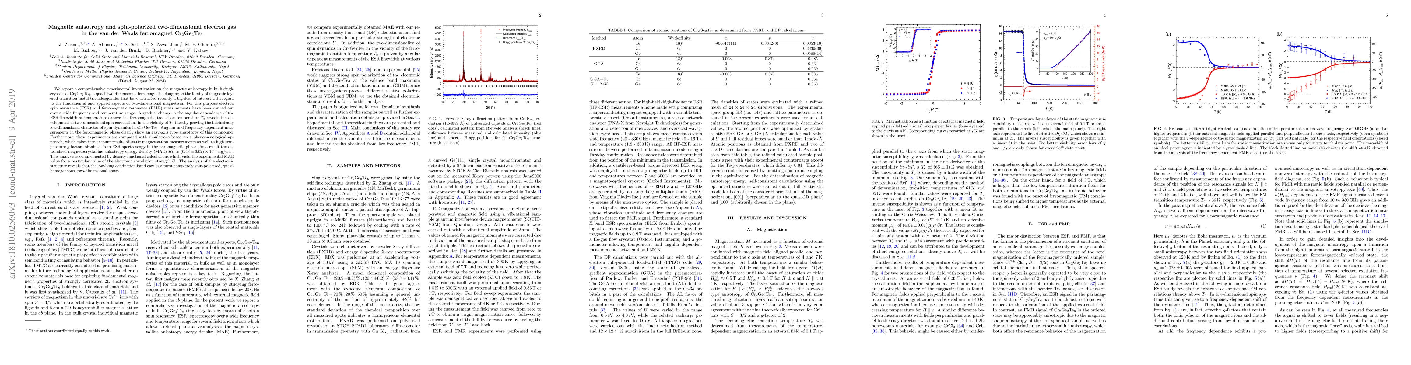 This paper investigates the magnetic anisotropy and spin-polarized two-dimensional electron gas in Cr$_2$Ge$_2$Te$_6$, a van der Waals ferromagnet, using ESR and FMR measurements. The study reveals an easy-axis anisotropy and a magnetocrystalline anisotropy energy density of $(0.48 \pm 0.02) \times10^6$ erg/cm$^3$, and shows that the conduction band exhibits spin-polarized, two-dimensional states.
