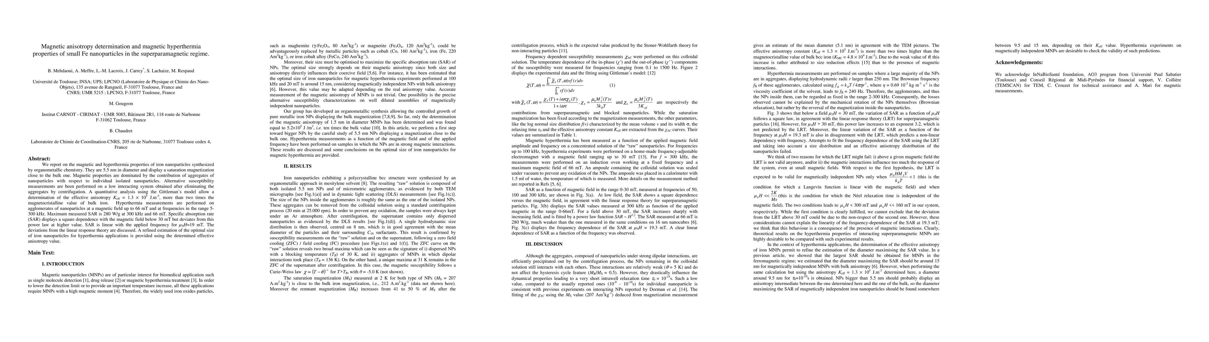 This study investigates the magnetic anisotropy and hyperthermia properties of 5.5 nm iron nanoparticles synthesized via organometallic chemistry. The effective anisotropy is determined to be significantly higher than bulk iron, and the nanoparticles show promising hyperthermia potential with a maximum specific absorption rate of 280 W/g at 300 kHz and 66 mT.