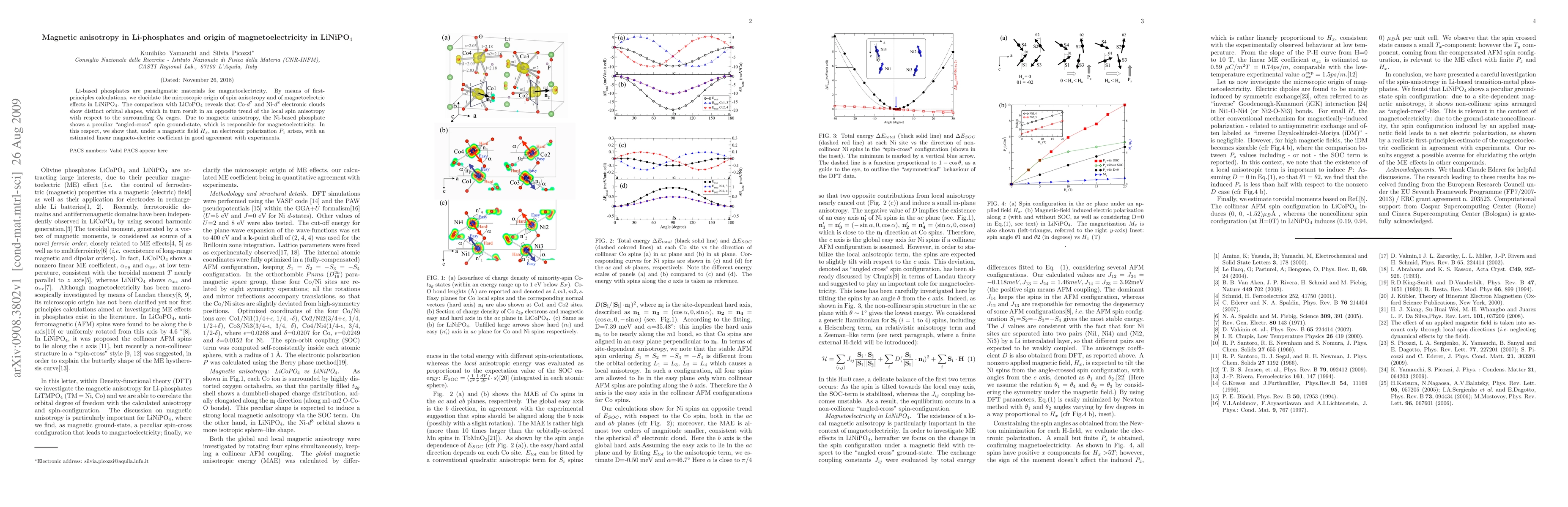 Li-based phosphates are paradigmatic materials for magnetoelectricity. By means of first-principles calculations, we elucidate the microscopic origin of spin anisotropy and of magnetoelectric effects in LiNiPO4. The comparison with LiCoPO4 reveals that Co-d7 and Ni-d8 electronic clouds show distinct orbital shapes, which in turn result in an opposite trend of the local spin anisotropy with respect to the surrounding O6 cages. Due to magnetic anisotropy, the Ni-based phosphate shows a peculiar "angled-cross" spin ground-state, which is responsible for magnetoelectricity. In this respect, we show that, under a magnetic field Hx, an electronic polarization Pz arises, with an estimated linear magneto-electric coefficient in good agreement with experiments.