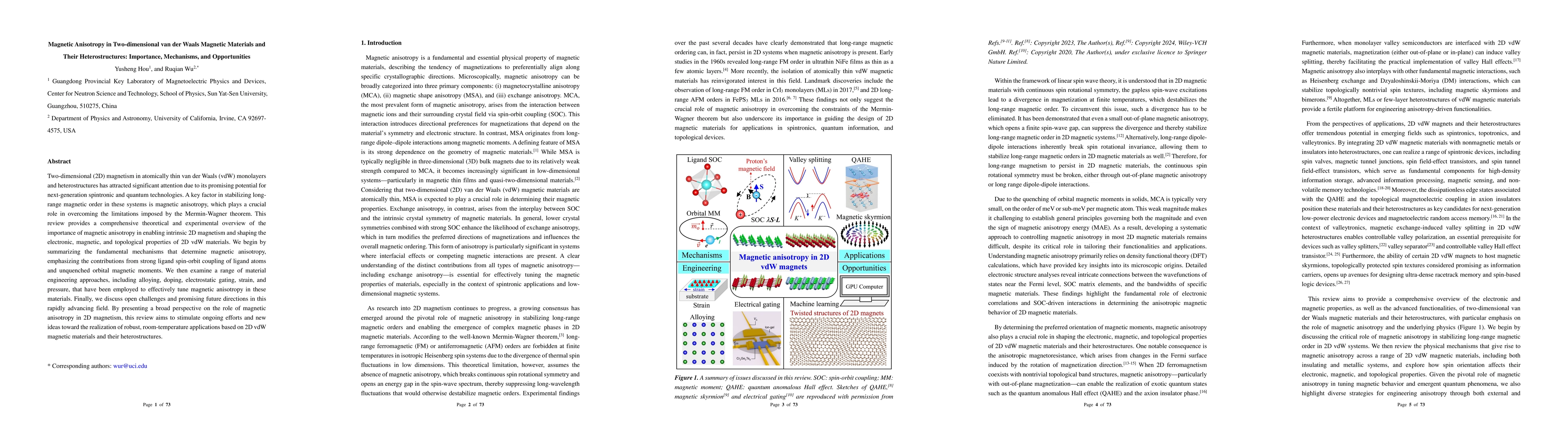 Two-dimensional (2D) magnetism in atomically thin van der Waals (vdW) monolayers and heterostructures has attracted significant attention due to its promising potential for next-generation spintronic and quantum technologies. A key factor in stabilizing long-range magnetic order in these systems is magnetic anisotropy, which plays a crucial role in overcoming the limitations imposed by the Mermin-Wagner theorem. This review provides a comprehensive theoretical and experimental overview of the importance of magnetic anisotropy in enabling intrinsic 2D magnetism and shaping the electronic, magnetic, and topological properties of 2D vdW materials. We begin by summarizing the fundamental mechanisms that determine magnetic anisotropy, emphasizing the contributions from strong ligand spin-orbit coupling of ligand atoms and unquenched orbital magnetic moments. We then examine a range of material engineering approaches, including alloying, doping, electrostatic gating, strain, and pressure, that have been employed to effectively tune magnetic anisotropy in these materials. Finally, we discuss open challenges and promising future directions in this rapidly advancing field. By presenting a broad perspective on the role of magnetic anisotropy in 2D magnetism, this review aims to stimulate ongoing efforts and new ideas toward the realization of robust, room-temperature applications based on 2D vdW magnetic materials and their heterostructures.