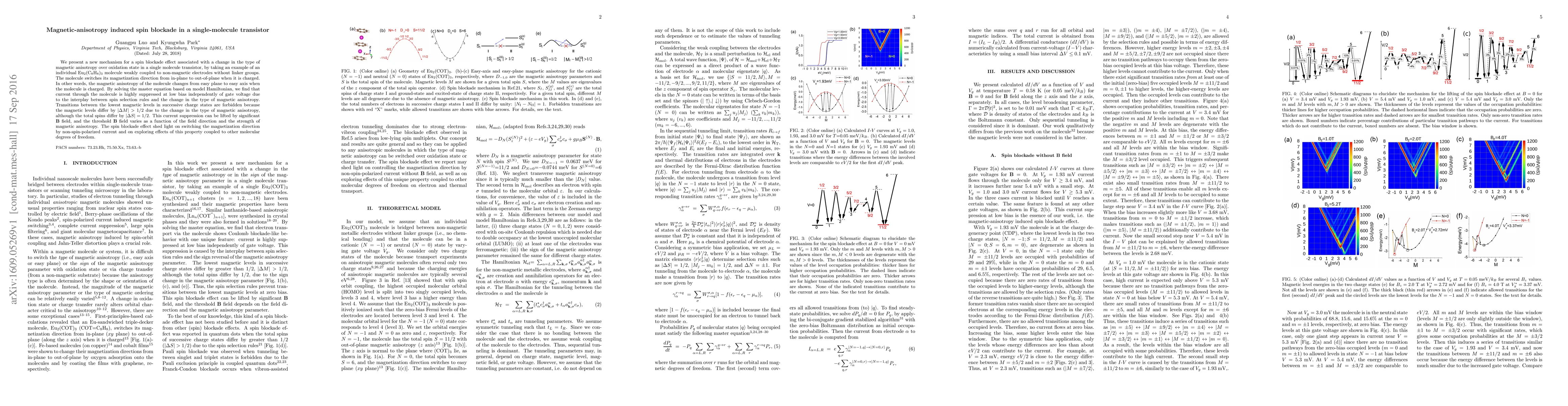 We present a new mechanism for a spin blockade effect associated with a change in the type of magnetic anisotropy over oxidation state in a single molecule transistor, by taking an example of an individual Eu$_{2}$(C$_{8}$H$_{8}$)$_{3}$ molecule weakly coupled to non-magnetic electrodes without linker groups. The molecule switches its magnetization direction from in-plane to out-of-plane when it is charged. In other words, the magnetic anisotropy of the molecule changes from easy plane to easy axis when the molecule is charged. By solving the master equation based on model Hamiltonian, we find that current through the molecule is highly suppressed at low bias independently of gate voltage due to the interplay between spin selection rules and the change in the type of magnetic anisotropy. Transitions between the lowest magnetic levels in successive charge states are forbidden because the magnetic levels differ by $|\Delta M| > 1/2$ due to the change in the type of magnetic anisotropy, although the total spins differ by $|\Delta S|=1/2$. This current suppression can be lifted by significant B field, and the threshold B field varies as a function of the field direction and the strength of magnetic anisotropy. The spin blockade effect shed light on switching the magnetization direction by non-spin-polarized current and on exploring effects of this property coupled to other molecular degrees of freedom.