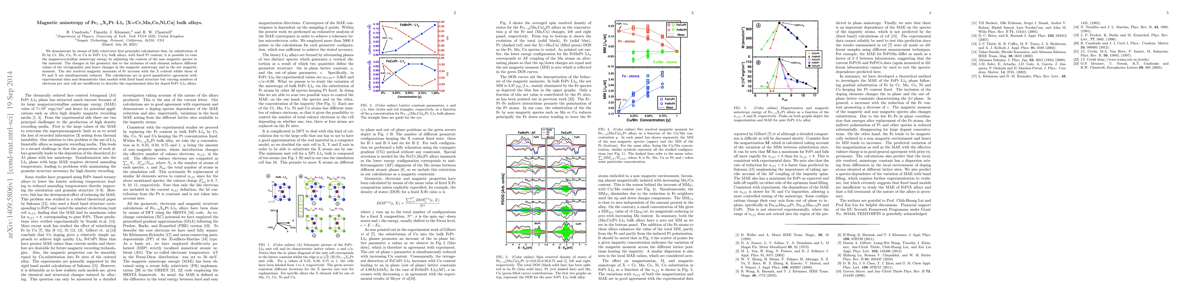 This study demonstrates that substituting Fe with Cr, Mn, Co, Ni, or Cu in FePt-L10 alloys tunes magnetocrystalline anisotropy through changes in tetragonality and magnetic moments, with Fe moments increasing and Pt and X moments decreasing. Calculations match experimental data, highlighting the need for models considering variable electron numbers per unit cell.