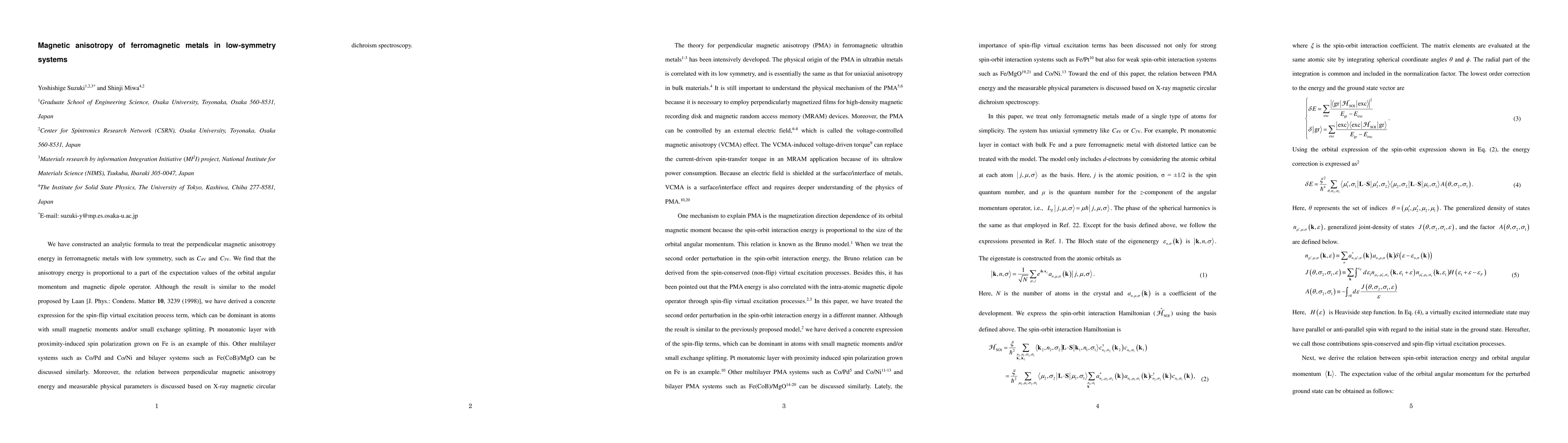 We have constructed an analytic formula to treat the perpendicular magnetic anisotropy energy in ferromagnetic metals with low symmetry, such as C4V and C3V. We find that the anisotropy energy is proportional to a part of the expectation values of the orbital angular momentum and magnetic dipole operator. Although the result is similar to the model proposed by Laan [J. Phys.: Condens. Matter 10, 3239 (1998)], we have derived a concrete expression for the spin-flip virtual excitation process term, which can be dominant in atoms with small magnetic moments and/or small exchange splitting. Pt monatomic layer with proximity-induced spin polarization grown on Fe is an example of this. Other multilayer systems such as Co/Pd and Co/Ni and bilayer systems such as Fe(CoB)/MgO can be discussed similarly. Moreover, the relation between perpendicular magnetic anisotropy energy and measurable physical parameters is discussed based on X-ray magnetic circular dichroism spectroscopy.