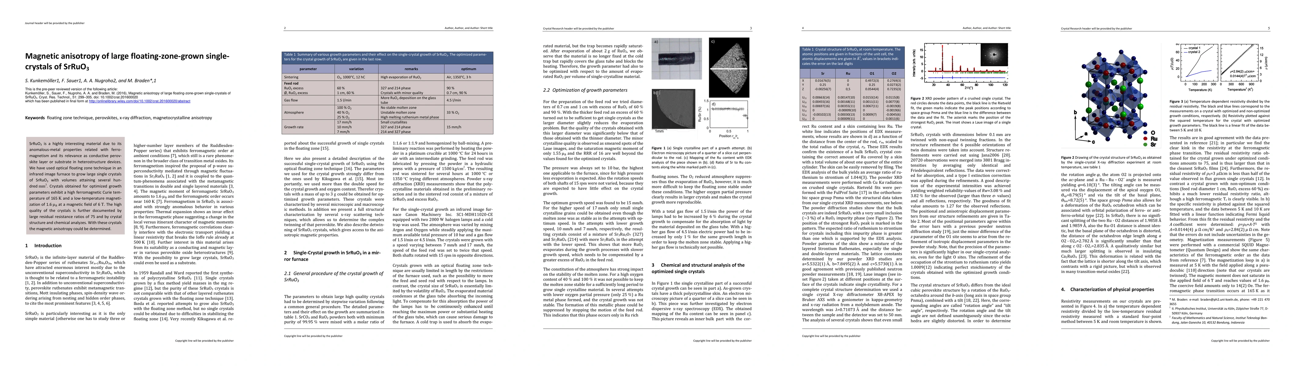 This paper investigates the magnetic anisotropy of large single-crystals of SrRuO3 grown using the optical floating zone technique, revealing high ferromagnetic Curie temperature and low-temperature magnetization, along with detailed crystal structure and chemical analysis confirming the material's quality. The study determines the magnetic anisotropy of these optimized crystals.