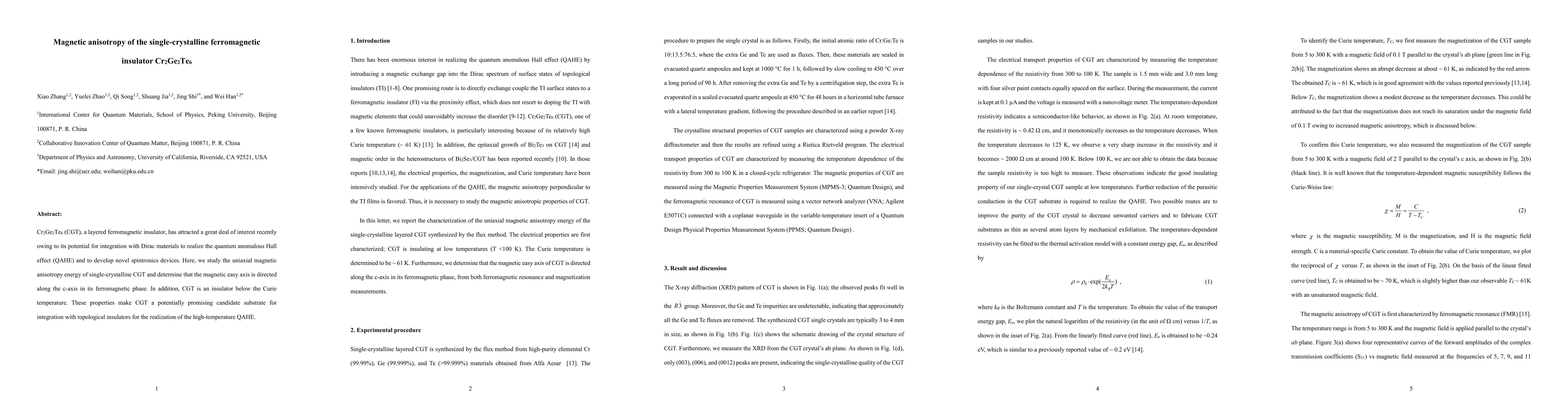 Cr2Ge2Te6 (CGT), a layered ferromagnetic insulator, has attracted a great deal of interest recently owing to its potential for integration with Dirac materials to realize the quantum anomalous Hall effect (QAHE) and to develop novel spintronics devices. Here, we study the uniaxial magnetic anisotropy energy of single-crystalline CGT and determine that the magnetic easy axis is directed along the c-axis in its ferromagnetic phase. In addition, CGT is an insulator below the Curie temperature. These properties make CGT a potentially promising candidate substrate for integration with topological insulators for the realization of the high-temperature QAHE.