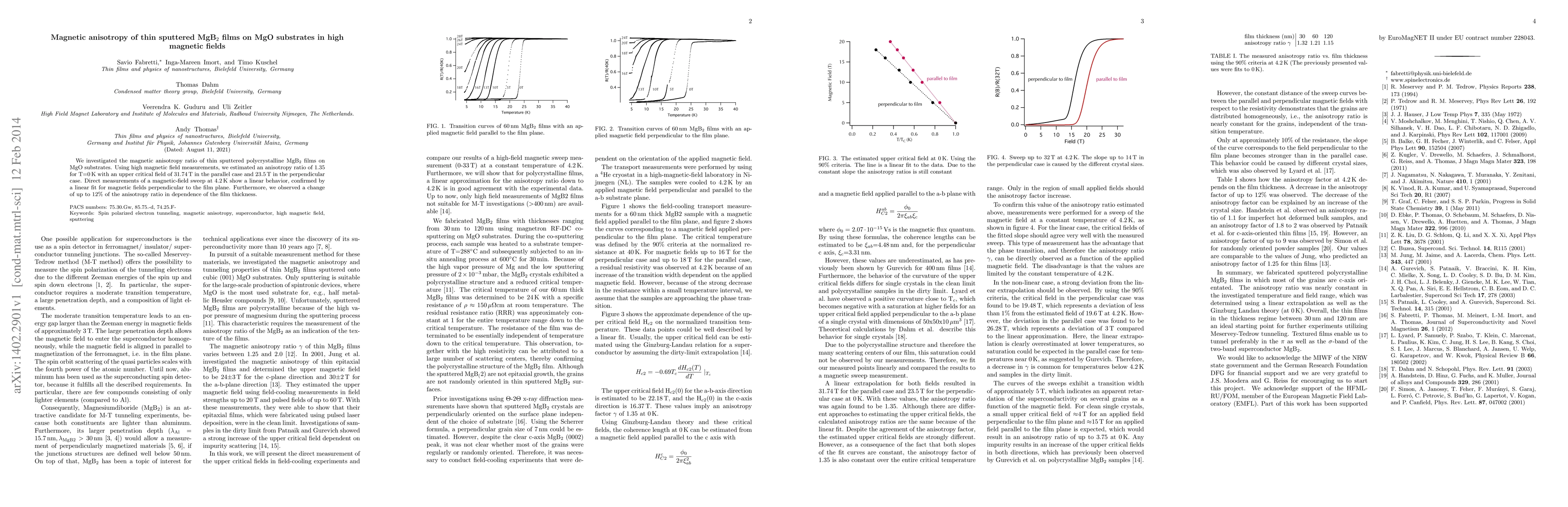 This study investigates the magnetic anisotropy of thin sputtered MgB2 films on MgO substrates, finding an anisotropy ratio of 1.35 at 0 K with distinct upper critical fields for parallel and perpendicular magnetic fields. The research also notes a 12% change in the anisotropy ratio with varying film thickness.