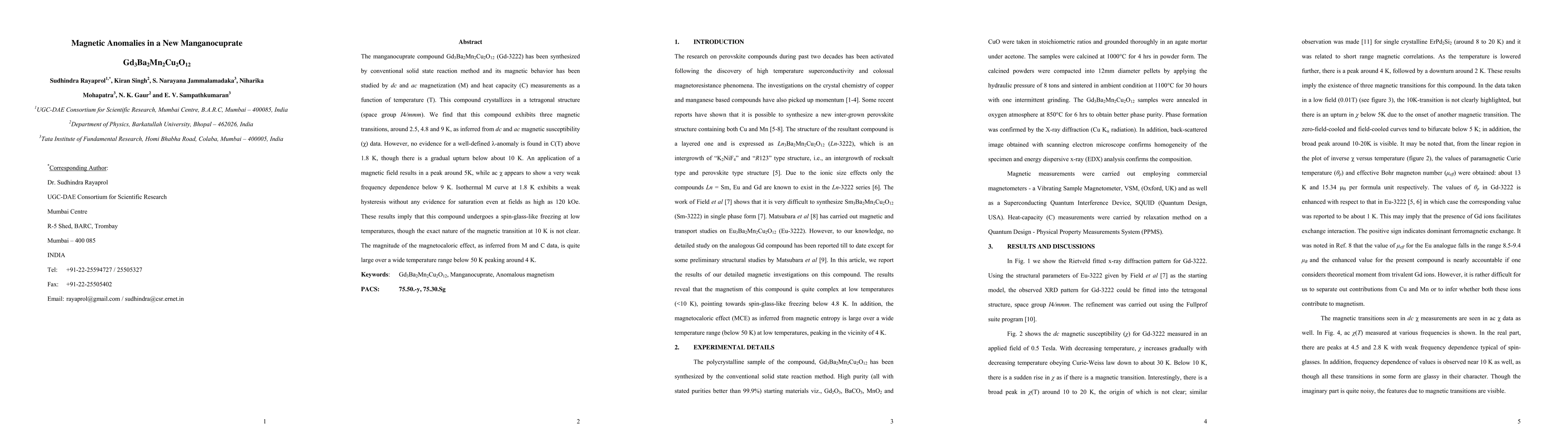 The manganocuprate compound Gd3Ba2Mn2Cu2O12 (Gd-3222) has been synthesized by conventional solid state reaction method and its magnetic behavior has been studied by dc and ac magnetization (M) and heat capacity (C) measurements as a function of temperature (T). This compound crystallizes in a tetragonal structure (space group I4/mmm). We find that this compound exhibits three magnetic transitions, around 2.5, 4.8 and 9 K, as inferred from dc and ac magnetic susceptibility (chi) data. However, no evidence for a well-defined lambda-anomaly is found in C(T) above 1.8 K, though there is a gradual upturn below about 10 K. An application of a magnetic field results in a peak around 5K, while ac chi appears to show a very weak frequency dependence below 9 K. Isothermal M curve at 1.8 K exhibits a weak hysteresis without any evidence for saturation even at fields as high as 120 kOe. These results imply that this compound undergoes a spin-glass-like freezing at low temperatures, though the exact nature of the magnetic transition at 10 K is not clear. The magnitude of the magnetocaloric effect, as inferred from M and C data, is quite large over a wide temperature range below 50 K peaking around 4 K.