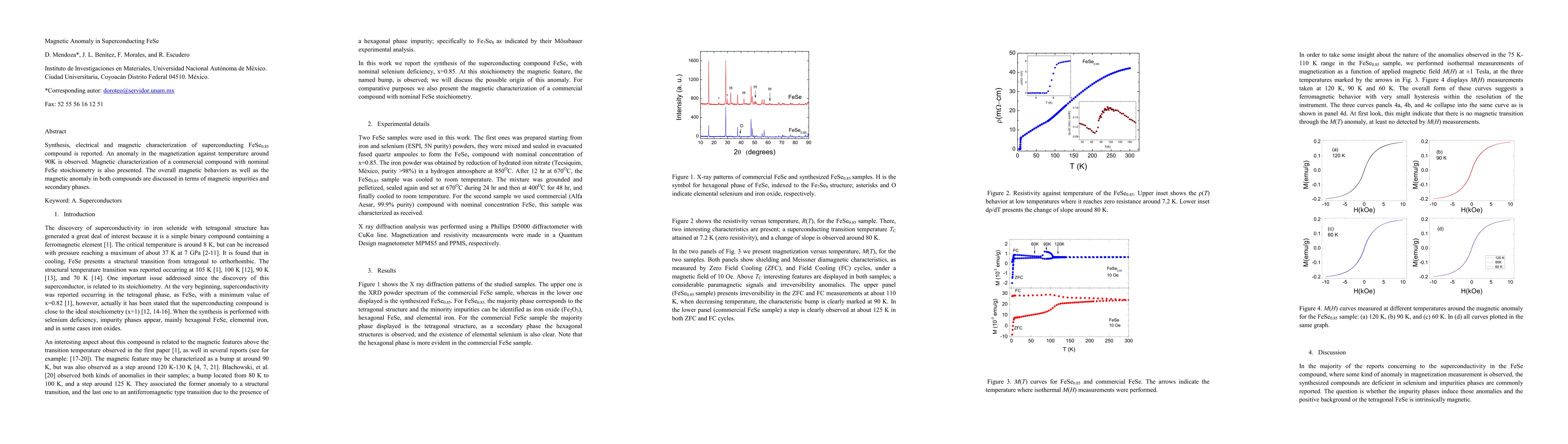 Synthesis, electrical and magnetic characterization of superconducting FeSe0.85 compound is reported. An anomaly in the magnetization against temperature around 90K is observed. Magnetic characterization of a commercial compound with nominal FeSe stoichiometry is also presented. The overall magnetic behaviors as well as the magnetic anomaly in both compounds are discussed in terms of magnetic impurities and secondary phases. Keyword: A. Superconductors