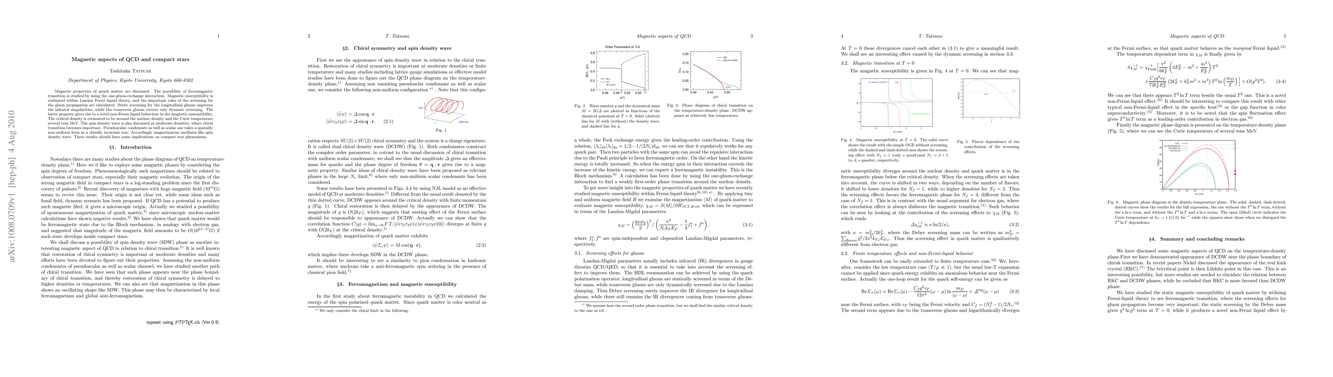 Magnetic properties of quark matter are discussed. The possibility of ferromagnetic transition is studied by using the one-gluon-exchange interaction. Magnetic susceptibility is evaluated within Landau Fermi liquid theory, and the important roles of the screening for the gluon propagation are elucidated. Static screening for the longitudinal gluons improves the infrared singularities, while the transverse gluons receive only dynamic screening. The latter property gives rise to a novel non-Fermi-liquid behaviour in the magnetic susceptibility. The critical density is estimated to be around the nuclear density and the Curie temperature several tens MeV. The spin density wave is also discussed at moderate densities, where chiral transition becomes important. Pseudoscalar condensate as well as scalar one takes a spatially non-uniform form in a chirally invariant way. Accordingly magnetization oscillates like spin density wave. These results should have some implications on compact star phenomena.