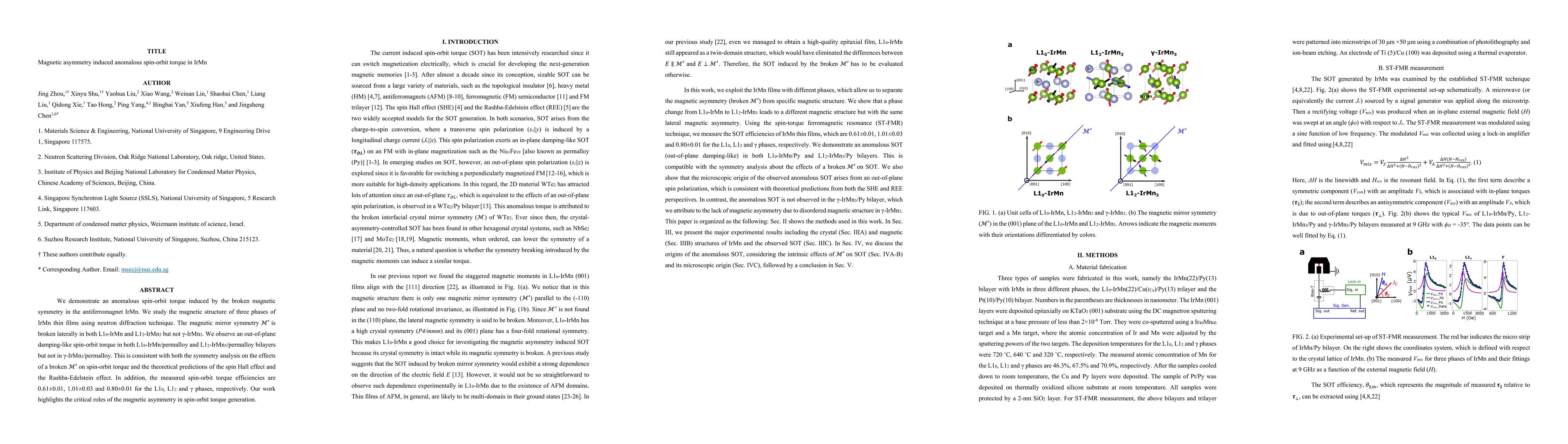 This study reveals that the broken magnetic symmetry in the antiferromagnet IrMn leads to anomalous spin-orbit torque, observed in L10-IrMn and L12-IrMn3 phases but not in γ-IrMn3. The spin-orbit torque efficiencies for L10, L12, and γ phases are 0.61±0.01, 1.01±0.03, and 0.80±0.01, respectively, emphasizing the importance of magnetic asymmetry in spin-orbit torque generation.