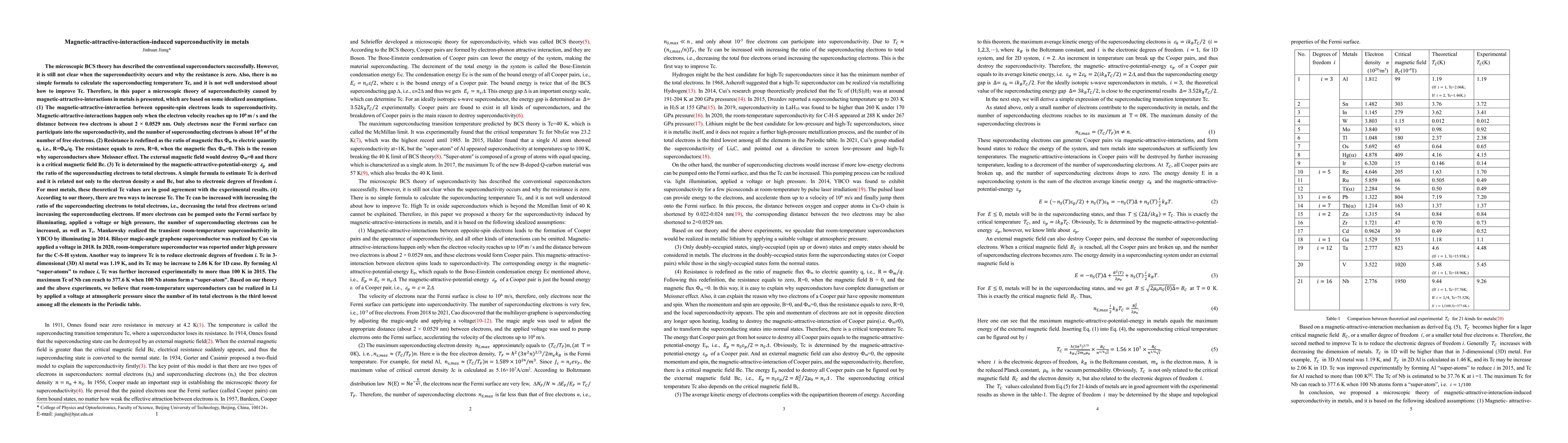 This paper presents a novel theory of superconductivity induced by magnetic attractive interactions, proposing that superconductivity occurs when electron velocities reach 106 m/s and magnetic flux is zero, leading to zero resistance. It also introduces a formula to estimate critical temperature Tc based on electron density, magnetic field, and electronic degrees of freedom.
